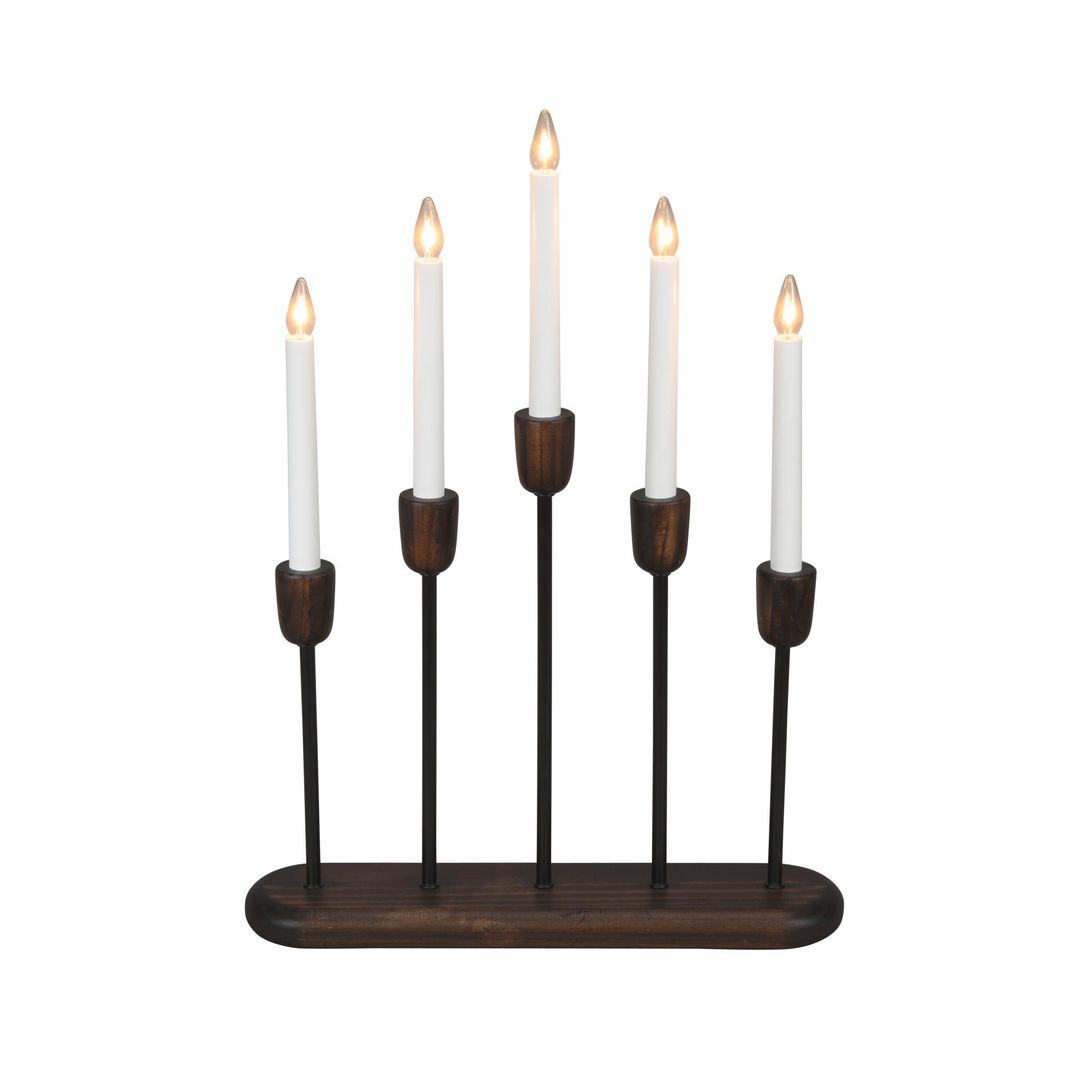 En 5 Armad elljusstake med vArmvita LED. Svart/valnöt. Anslutningssladd på 1,7 meter. Strömbrytare för manuell avstängning/påslagning. Höjd 53,5 cm och bredd 38 cm.