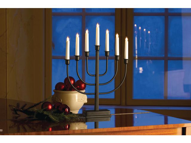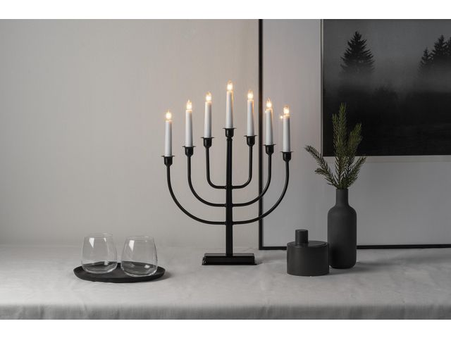 En 7-armad elljusstake i svartlackad metall. Anslutningssladd på 1,8 meter. Strömbrytare för manuell avstängning/påslagning. Höjd 45 cm och bredd 34 cm.