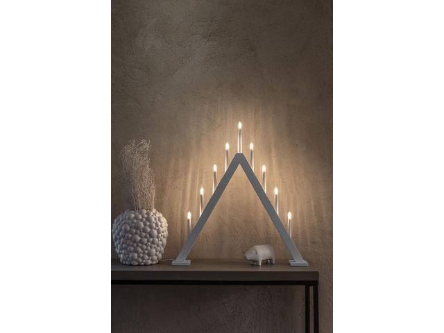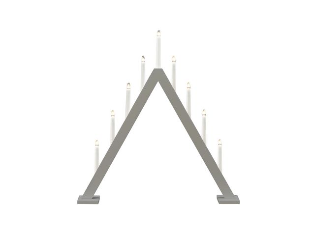 En 9-armad elljusstake i trä, lackad med grå matt färg. Passar bra i lite större fönster. Den har varmvita lampor och en vit anslutningssladd på 1,7 meter med strömbrytare. Höjd 65 cm och bredd 60 cm.