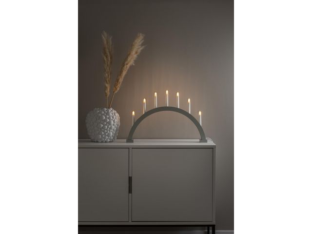 7-armad ljusstake i matt grågrönlackerat trä med vit kabel och strömbrytare. Ljusstaken är bågformad och är 59 cm bred och 38,5 cm hög med en kabel på 1,7 m.