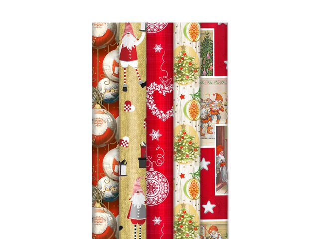 Julpapper i konsumentförpackning med 5 rullar. Finns med olika mönster och motiv.