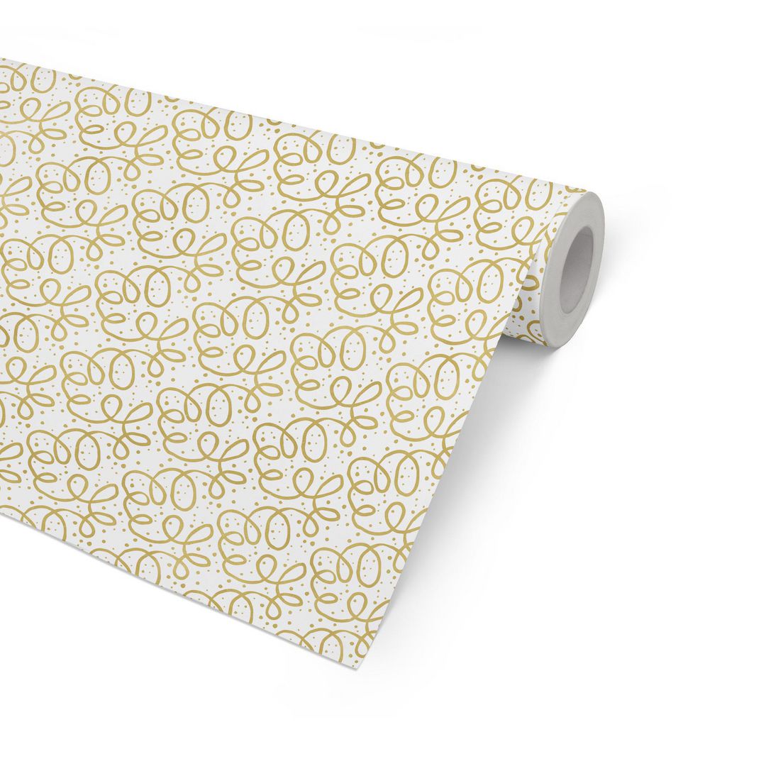 FSC-märkt presentpapper med dekorativt guldmönster mot vit bakgrund.