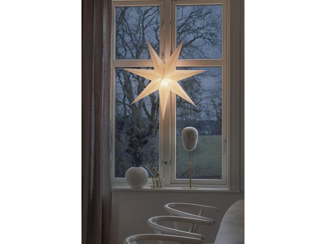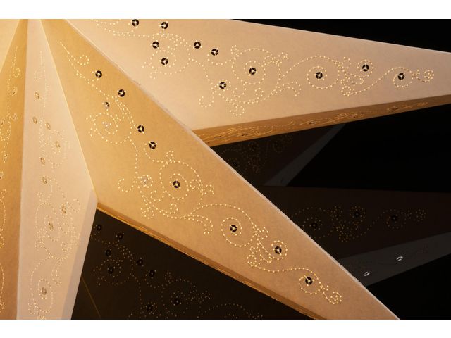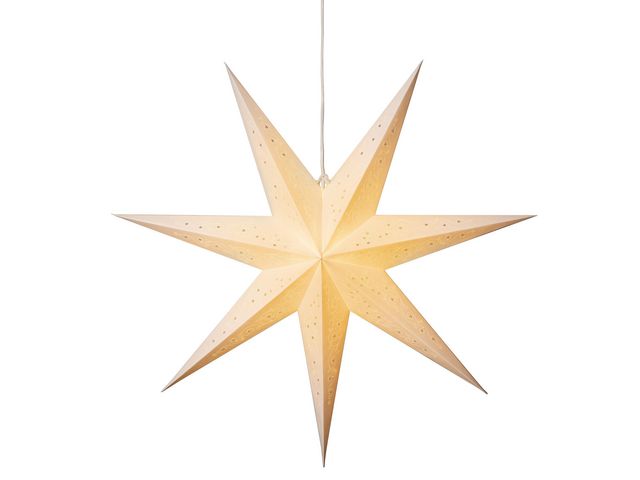 Hängande pappersstjärna med 7 uddar och broderat mönster. Sladdställ med 5 meter anslutningssladd ingår, E14-sockel. Sladdströmbrytare. Diameter 78 cm