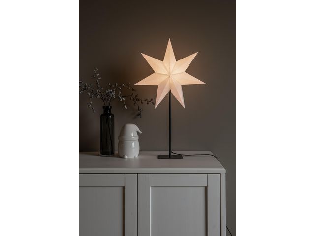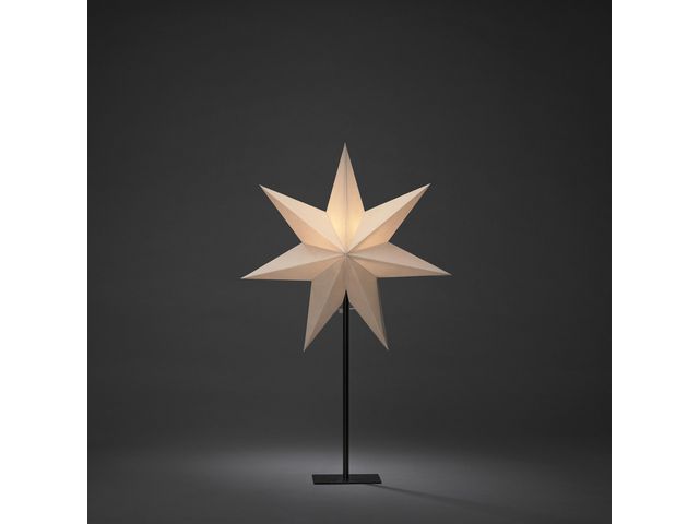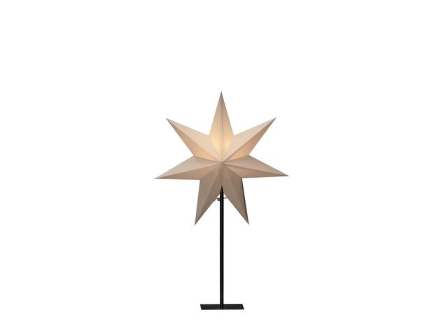 Pappersstjärna med 7 uddar på svart metallfot. Anslutningssladd på 2,4 meter med sladdströmbrytare. E14-sockel (ljuskälla ingår ej). Diameter 40 cm, Höjd 65 cm.