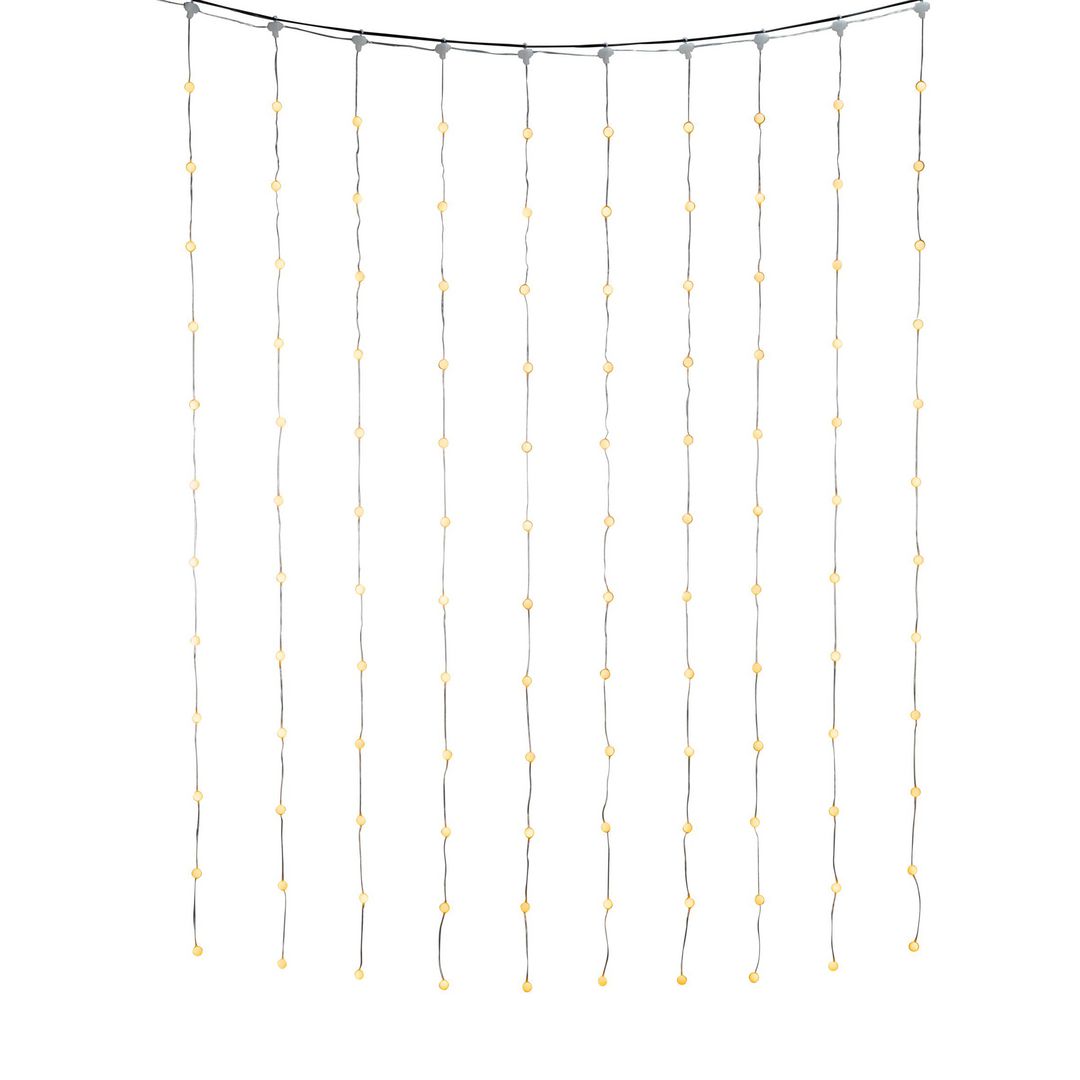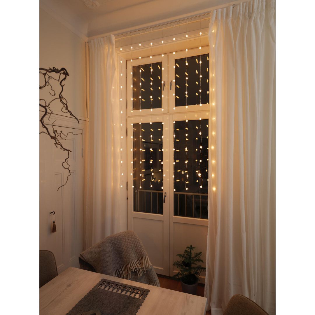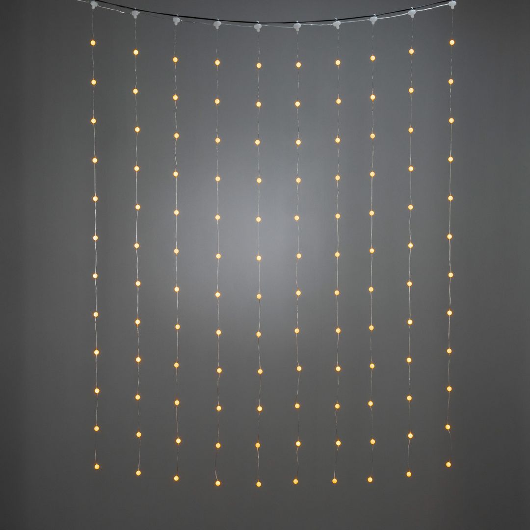 Gardinslinga med 120 amberfärgad frostad LED med vita kulor och transparent kabel. IP20. Lampavstånd 15cm. Höjd 180cm, bredd 135cm. Anslutningssladd USB på 300cm.