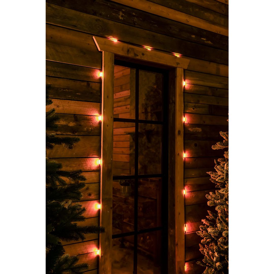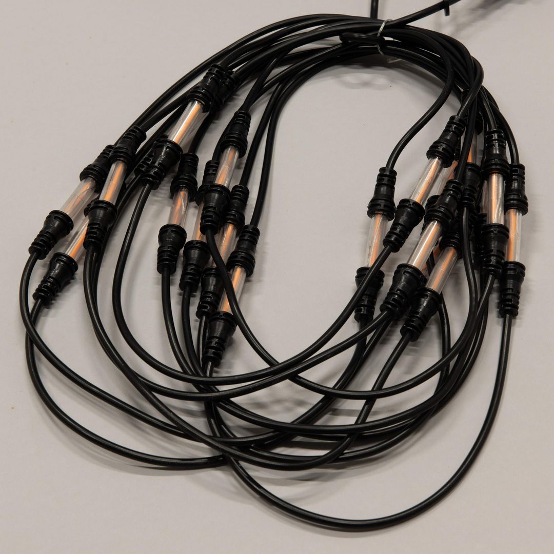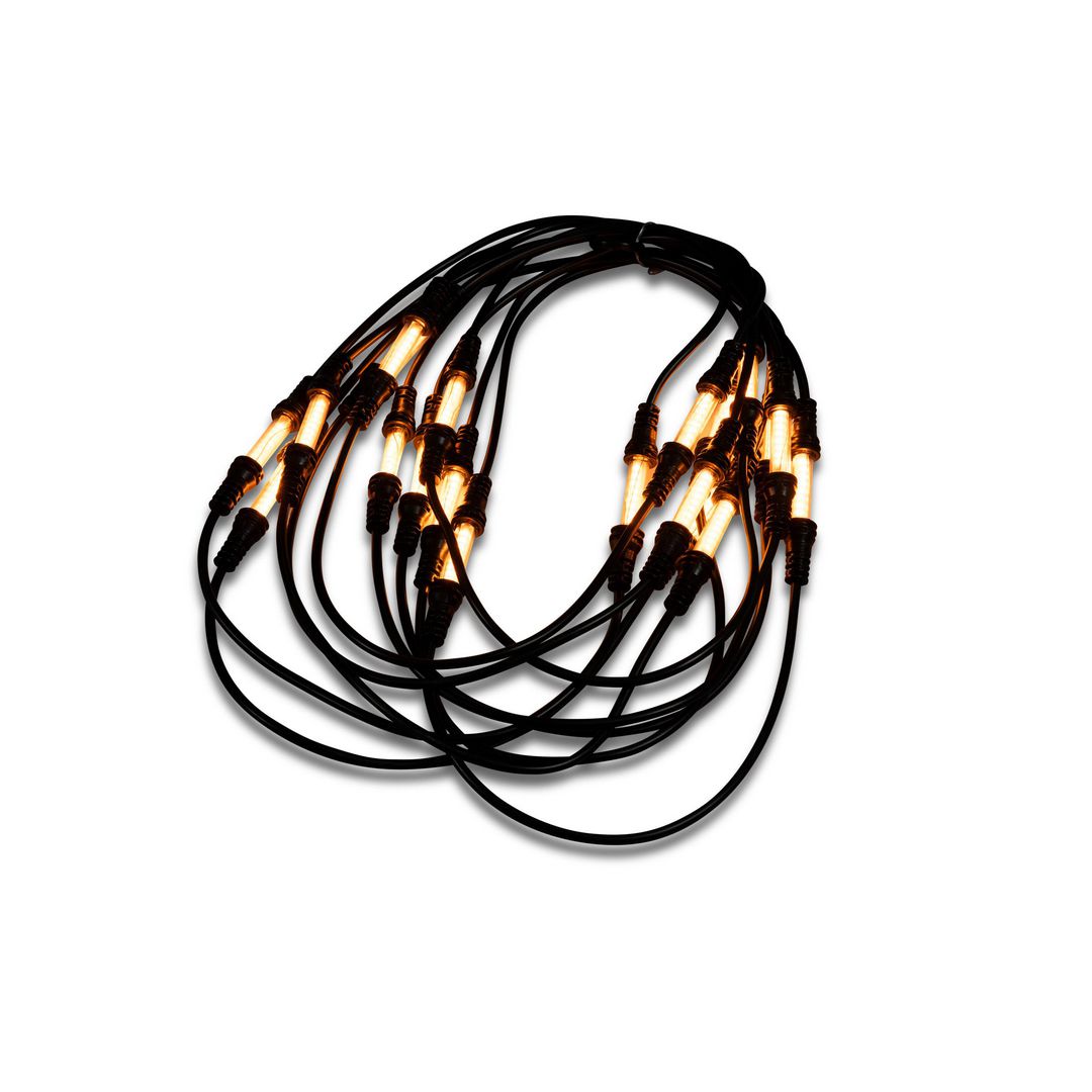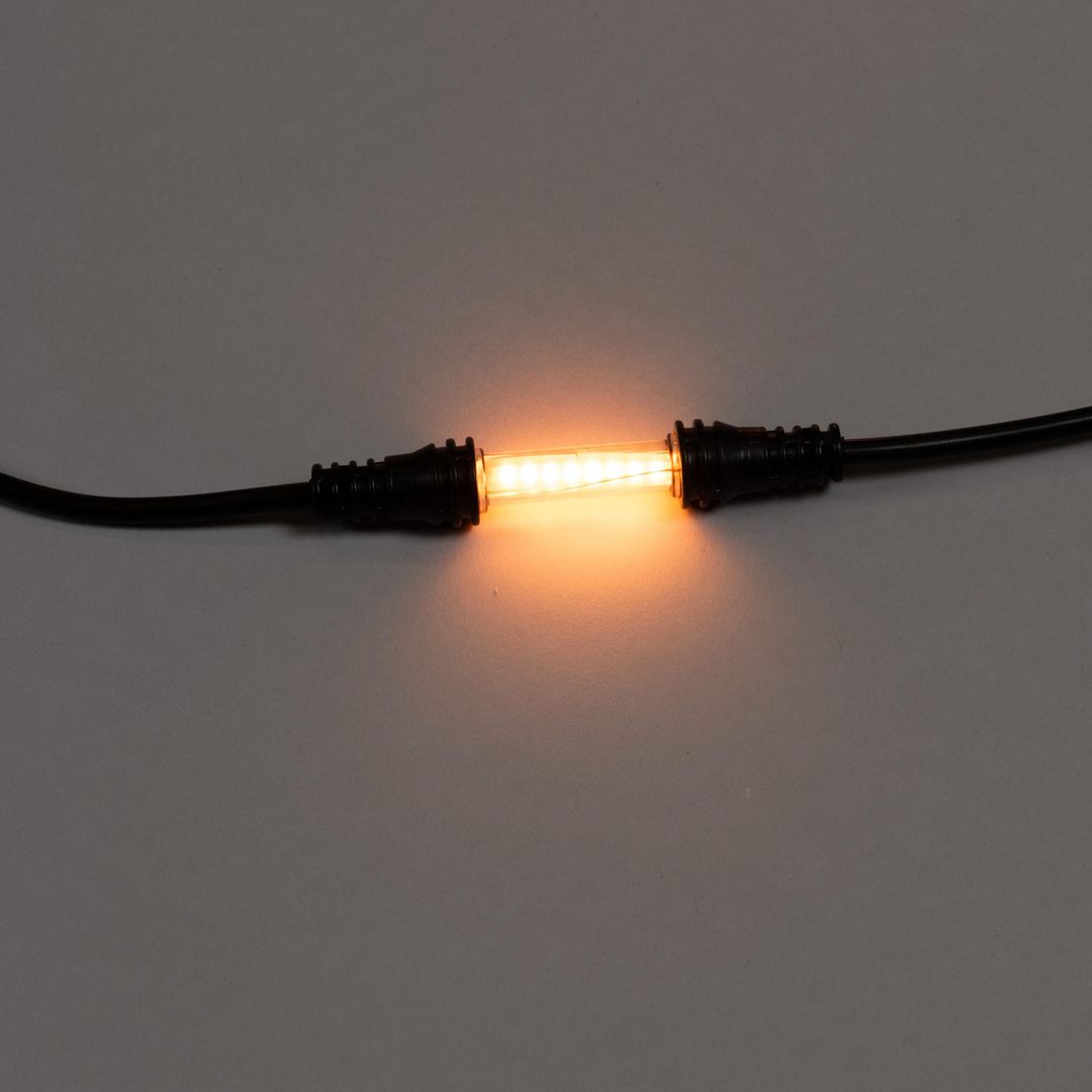 Slinga med 30 avlånga amberfärgade LED på 9,57m för utomhusbruk. Svart kabel. Drivs med en 30v transformator. Anslutningssladden är 1000cm.