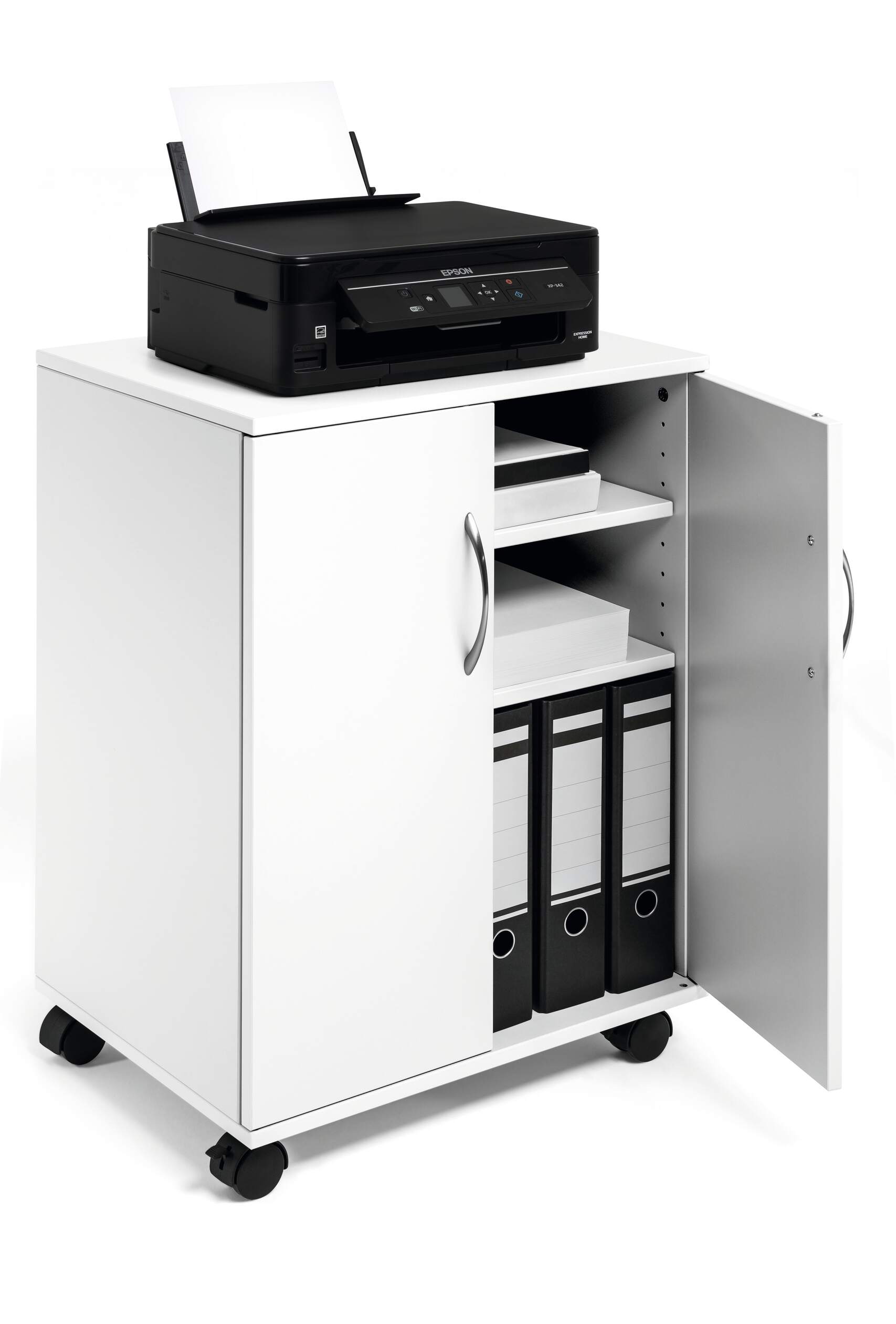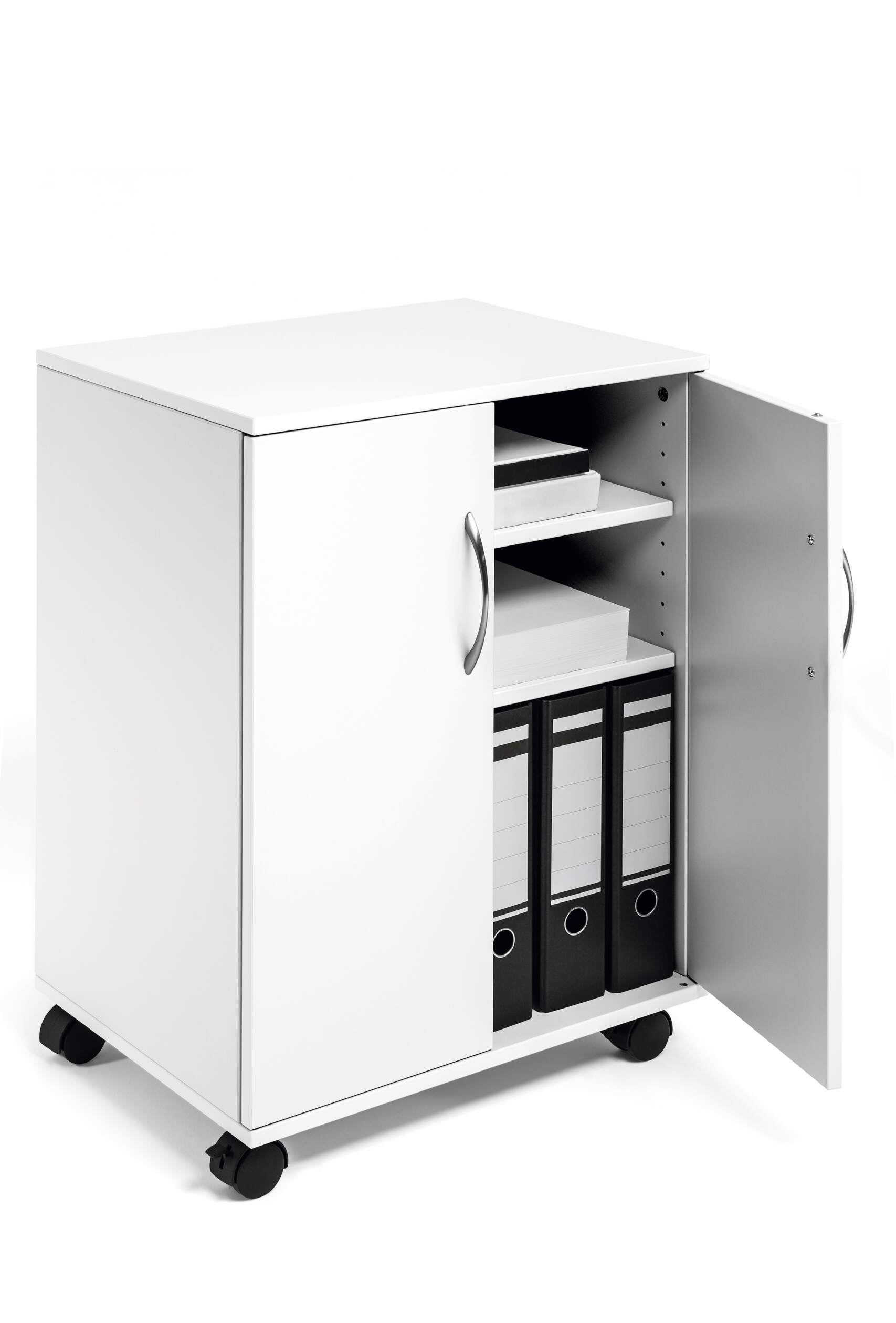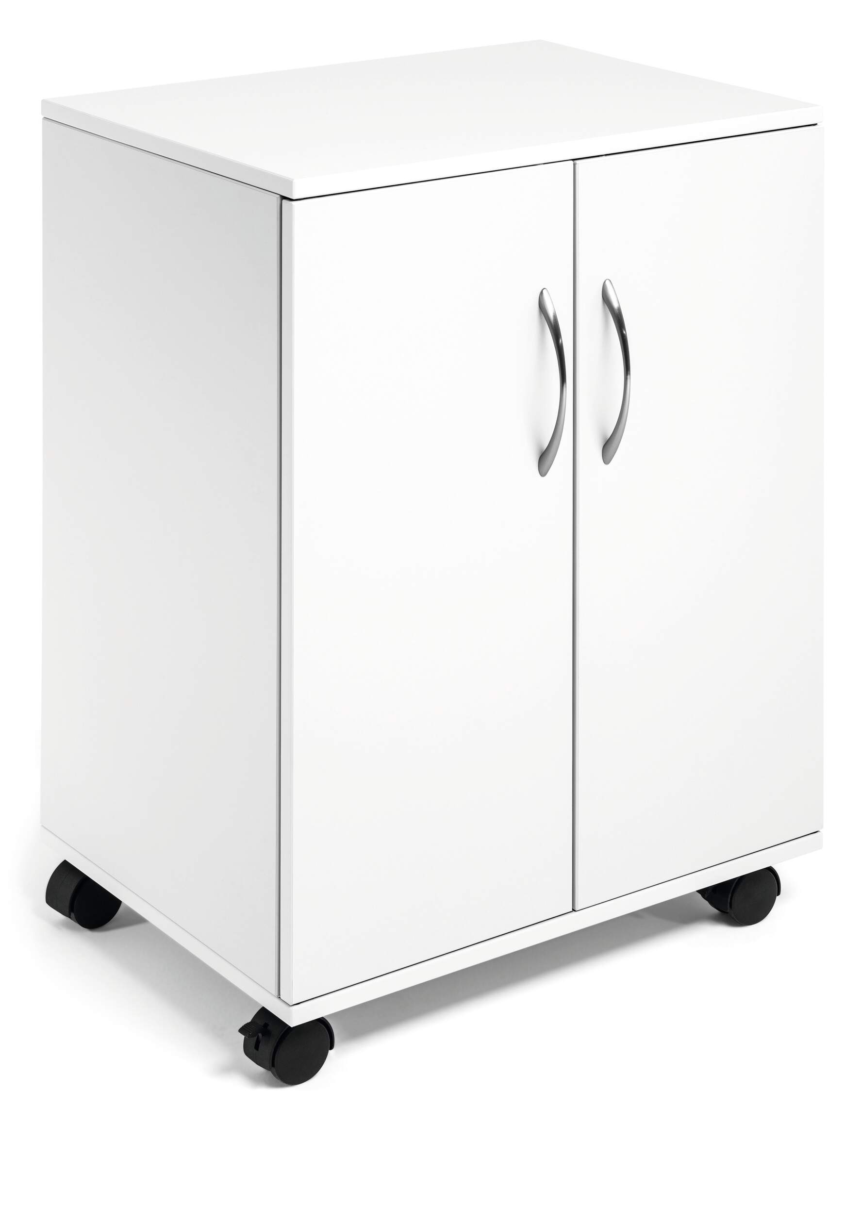 Mobil kontorshurts med dubbeldörrar som är praktisk och användbar på kontor, i konferensrum eller för mobila arbetsplatser för förvaring av skrivare och andra kontorstillbehör. Två fasta hyllor och två justerbara hyllor liksom skåpet är tillverkade av 16mm slitstarka träskivor. Varje hylla har en maxbelastning på 30 kg. 4 st svängbara länkhjul, varav 2 st har broms. Lätt att förflytta och stabil när den är "parkerad". Levereras i platt paket med monteringsanvisningar. Mått: 748 x 528 x 400 mm (HxBxD).