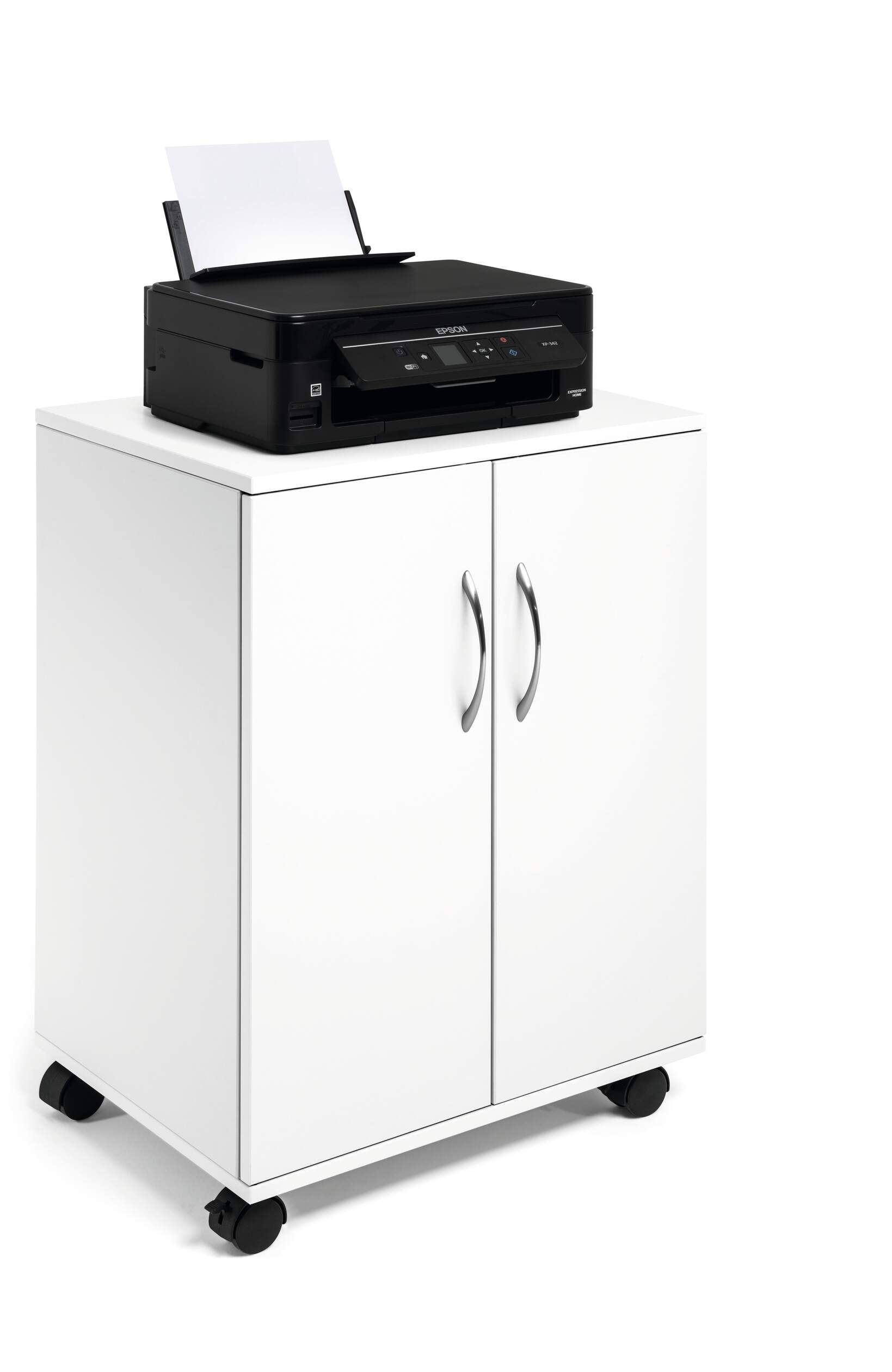 Mobil kontorshurts med dubbeldörrar som är praktisk och användbar på kontor, i konferensrum eller för mobila arbetsplatser för förvaring av skrivare och andra kontorstillbehör. Två fasta hyllor och två justerbara hyllor liksom skåpet är tillverkade av 16mm slitstarka träskivor. Varje hylla har en maxbelastning på 30 kg. 4 st svängbara länkhjul, varav 2 st har broms. Lätt att förflytta och stabil när den är "parkerad". Levereras i platt paket med monteringsanvisningar. Mått: 748 x 528 x 400 mm (HxBxD).Visa mer beskrivningVisa mindre beskrivning -