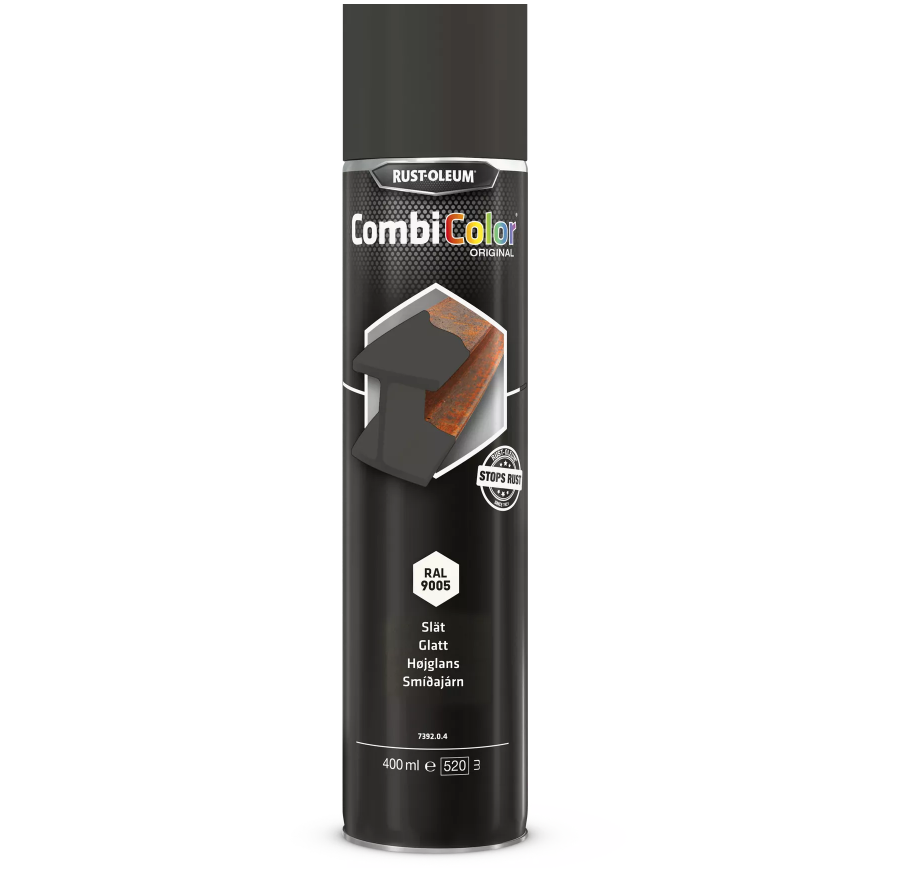 Rust-Oleum Combicolor Aerosol Original 400ml är ett enstegs aerosolsystem för metallskydd med primer och täckfärg i ett. Kan appliceras direkt på rost, naket metall eller med CombiPrimer Anti-Corrosion 3369/3380 för primade ytor. Lämplig för mindre underhållsjobb eller touch-ups i lätt industriella miljöer med normal luftfuktighet och inomhusapplikationer. Produkten är baserad på urethanmodifierad alkyd, fri från bly och kromat, innehåller rostskyddande pigment och ger en högblank, hållbar finish med god täckförmåga.