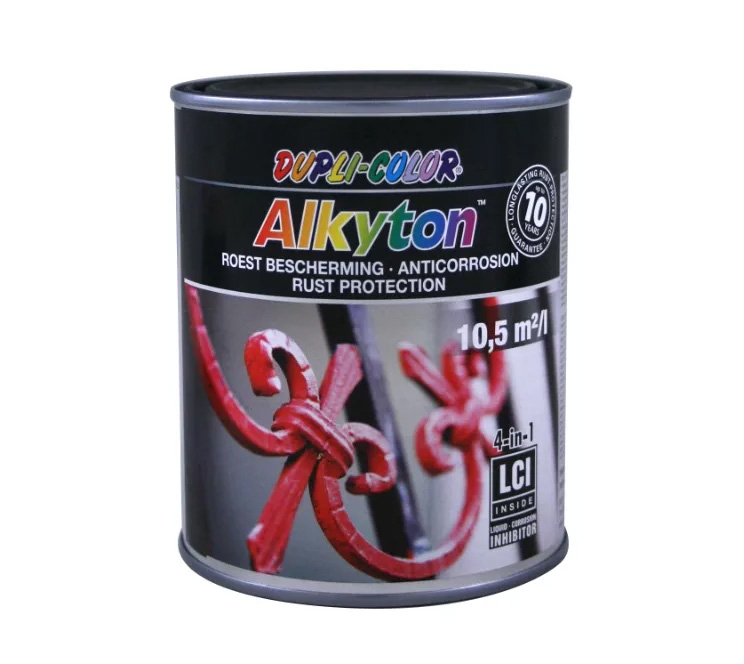 DUPLI-COLOR Alkyton är en rostskyddande uretanbaserad alkydhartsfärg som förenar 4 produkter i en produkt: Grundfärg, rostskydd, färg och tätning. Denna ytterst täckande färg har hög elasticitet och är stöttålig, även när temperaturen ändras eller när underlaget böjs. Färgens höga pigmenthalt ger mycket god täckning på 10,5 m²/l med ett lager. Kan appliceras med borste,roller eller färgspruta. För ett större urval av nyanser går det att blanda olika färger (färger med färger, effekter med effekter).