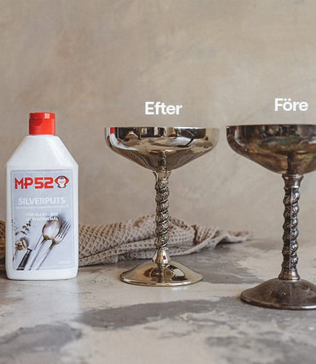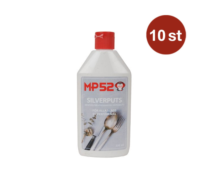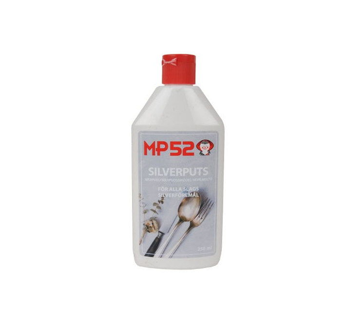 Med MP52 Silverputs får du en effektiv produkt för att rengöra och polera dina silverföremål till ett skinande resultat. Den avlägsnar smuts, fläckar och beläggningar samtidigt som den skapar en skyddande yta som förhindrar nya missfärgningar. Silverputsen är enkel att använda och passar för allt från smycken och bestick till silverljusstakar och prydnadsföremål.
