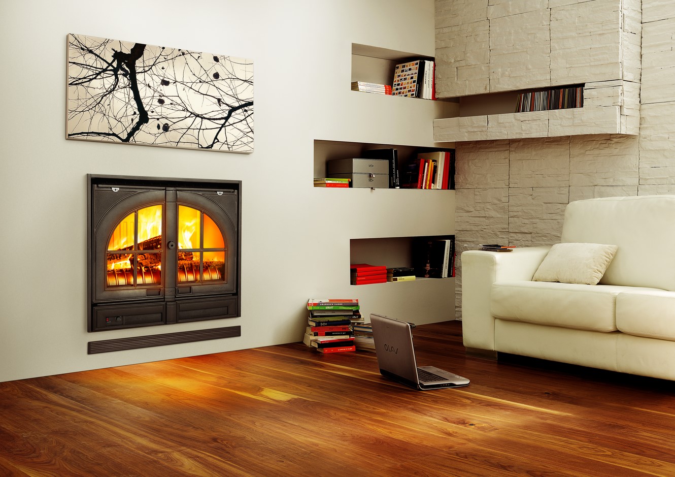 Alla våra kaminer och öppna spisar är vedeldade. Jämfört med fossila energikällor är ved ett naturligt bränsle som är ekonomiskt och miljövänligt, eftersom det är en förnybar och hållbar energikälla.