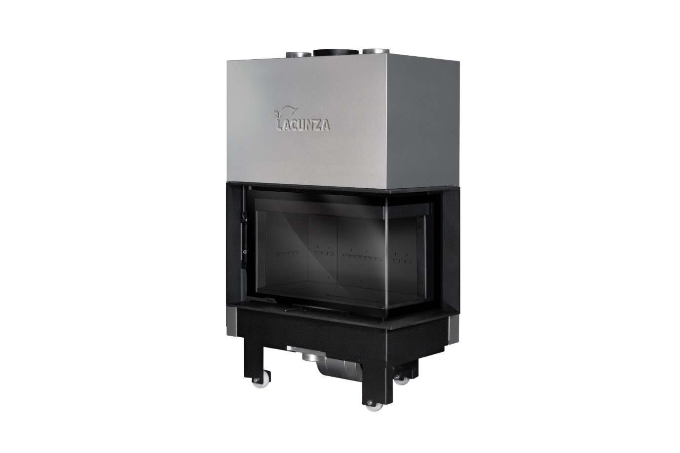 IZARO, en hörnkamin med en giljotindörr tillverkad av ett enda stycke rundat vinklat glas så att du kan njuta av eldens hypnotiska kraft. Du väljer själv vilken av de två sidorna du vill njuta av.