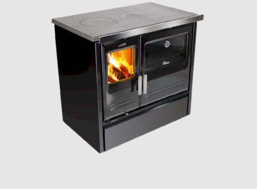 Vedeldad köksspis med yta i högkvalitativ emalj. Kan rengöras med bara en fuktig trasa.