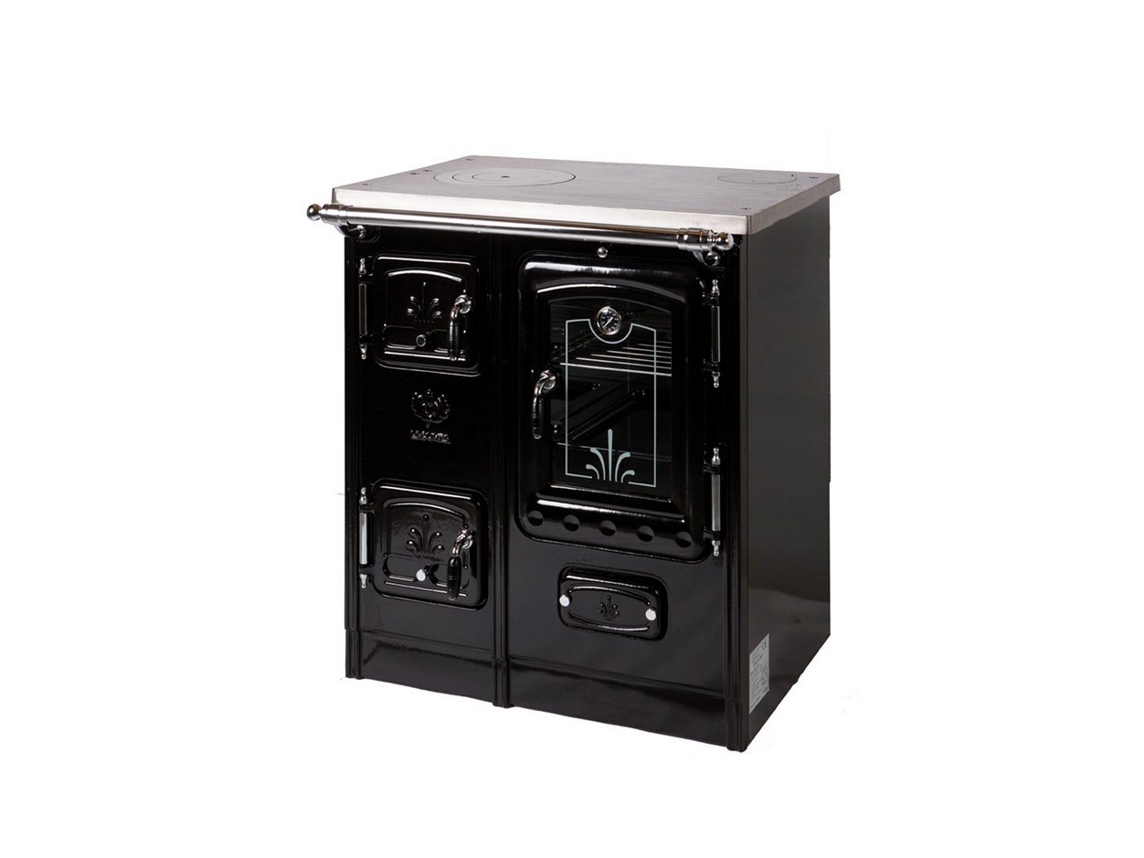 Vedeldad köksspis med yta i högkvalitativ emalj. Kan rengöras med bara en fuktig trasa.