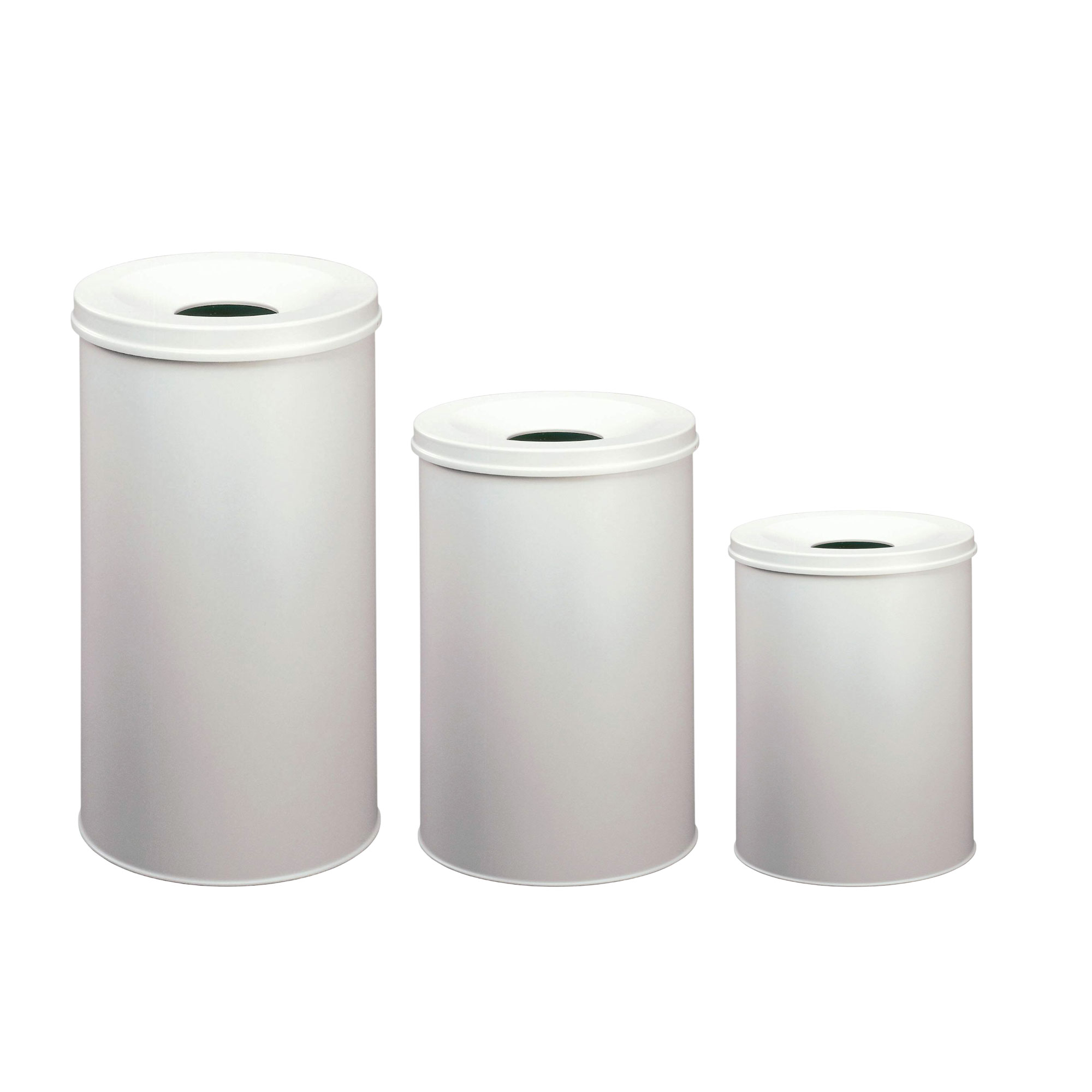 Papperskorg/avfallstunna med avtagbart, självsläckande lock som minskar syretillförseln och kväver lågorna om det börjar brinna i avfallsbehållaren. Kvaliteteskontrollerad och TÜV-certifierad som är en erkänd tysk produktsäkerhetscertifiering. Tillverkad av metall med reptålig epoxihartsbeläggning.