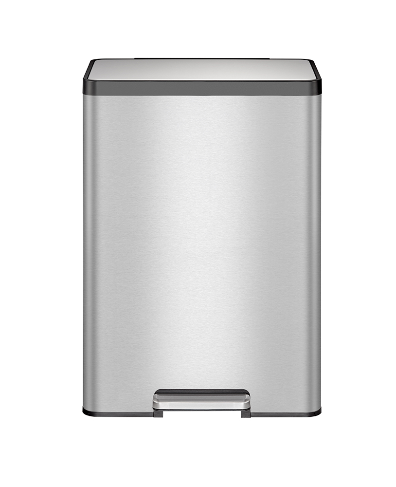 Rektangulärt pedalkärl med anti-fingeravtryck, handtag och mjuktstängande lock. Matt rostfritt stål.