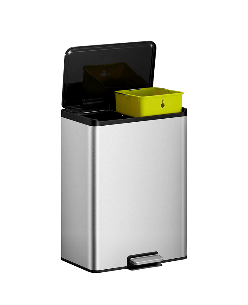 Rektangulärt pedalkärl för smidig avfallssortering med anti-fingeravtryck, separata innerkärl och mjuktstängande lock. 15+15 liter. Borstat rostfritt stål. Lämplig påse: Drawstring Trash Bags type D 18-21LVisa mer beskrivningVisa mindre beskrivning -