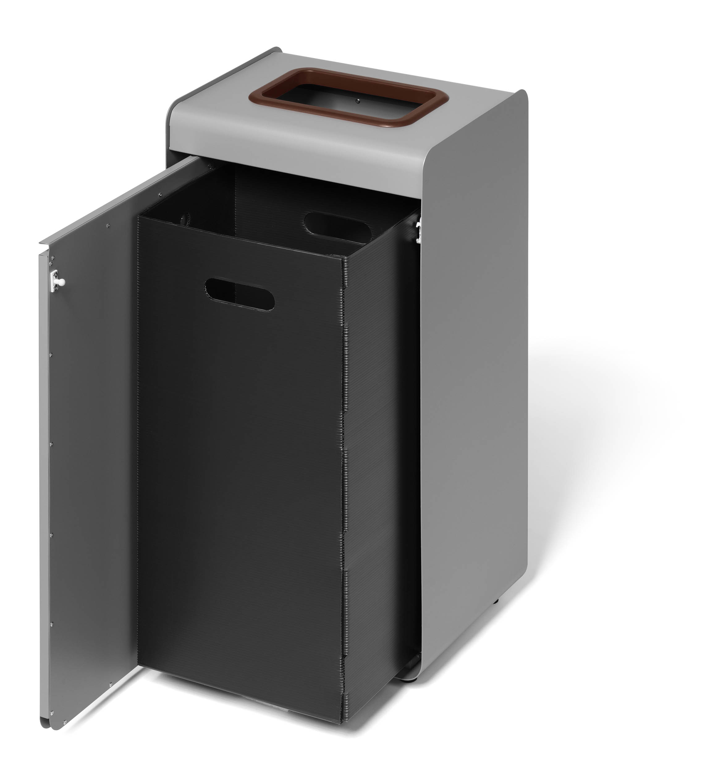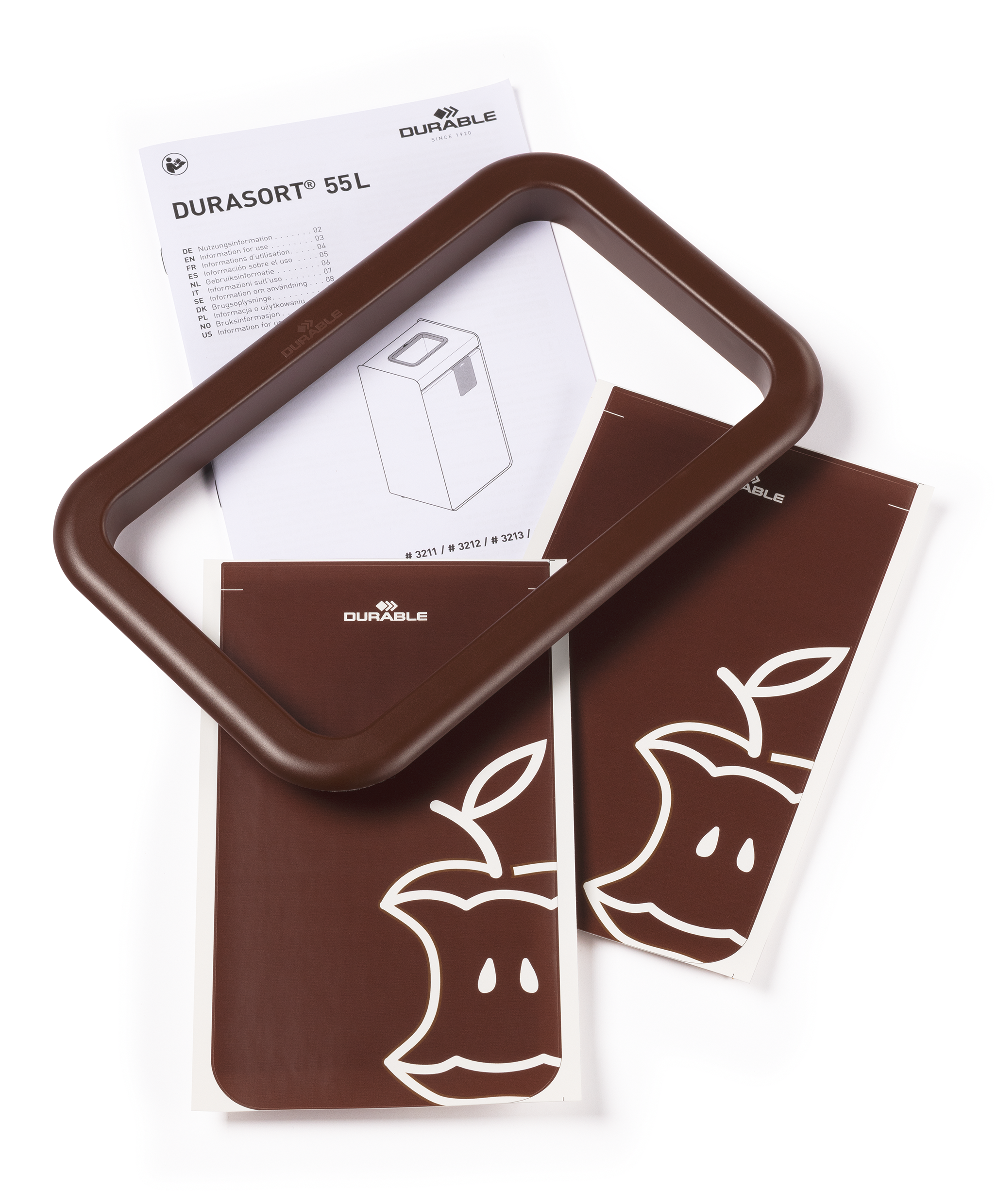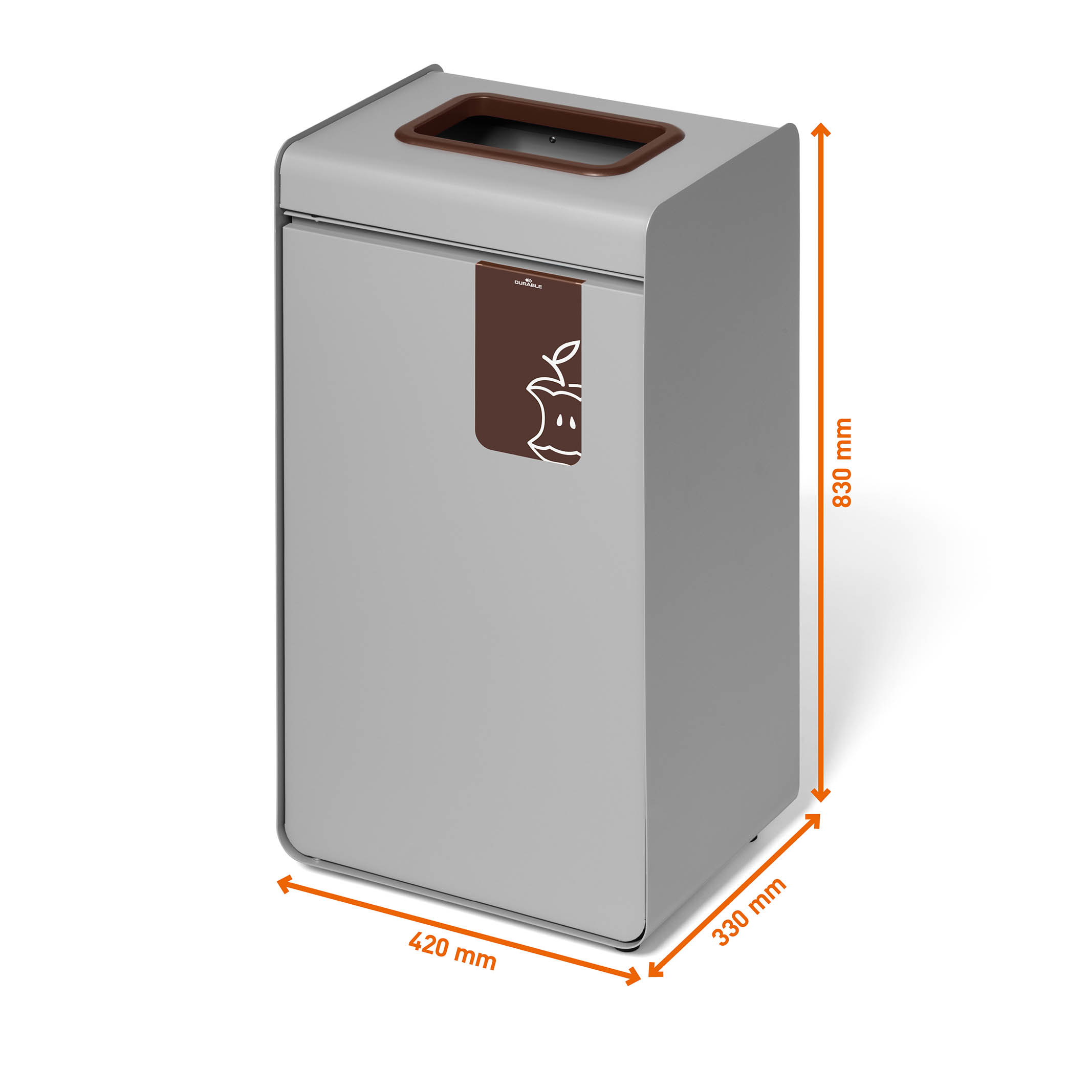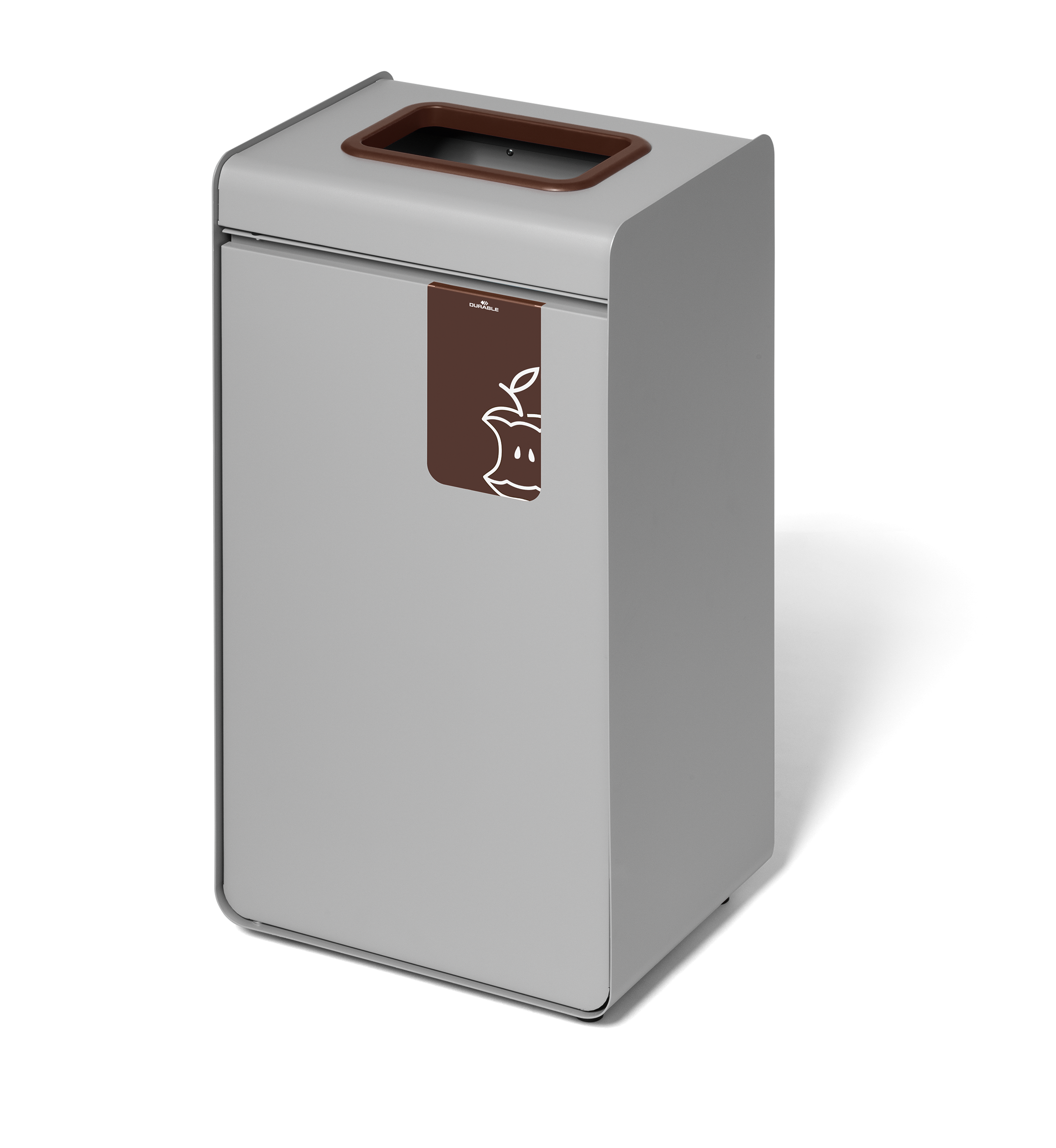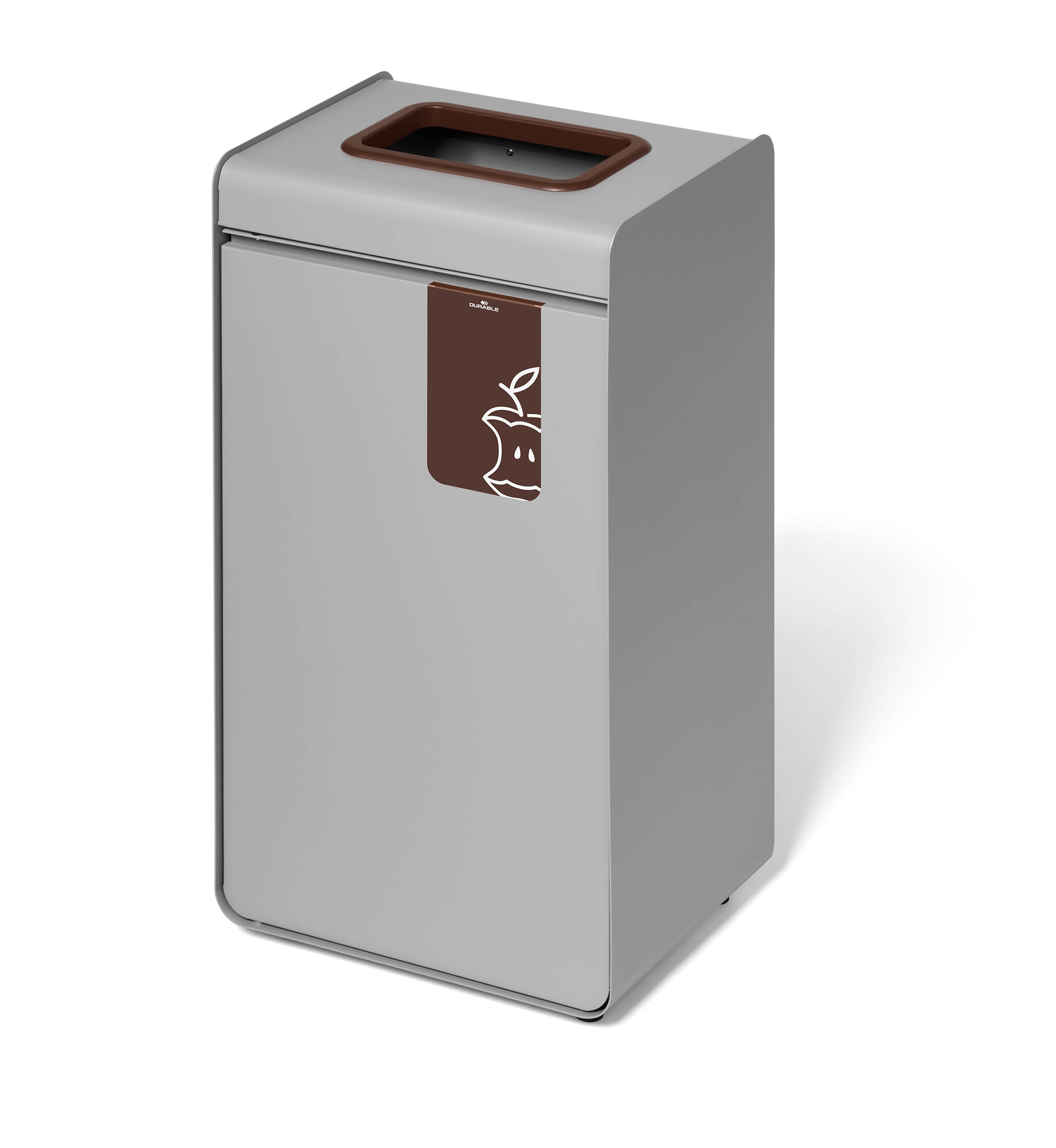Återvinningskärl Durable Durasort Matavfall Brun 55L är ett robust och modernt återvinningskärl av pulverlackad metall med innerbehållare i plast. Den bruna öppningen och symbolen framtill markerar tydligt att kärlet är avsett för matavfall. Perfekt för användning inomhus i exempelvis publika lokaler, skolor och matsalar. Tryck-och-öppna-mekanismen gör det enkelt att öppna dörren, medan den borttagbara innerbehållaren underlättar tömning. Justerbara fötter säkerställer stabilitet även på ojämna underlag.