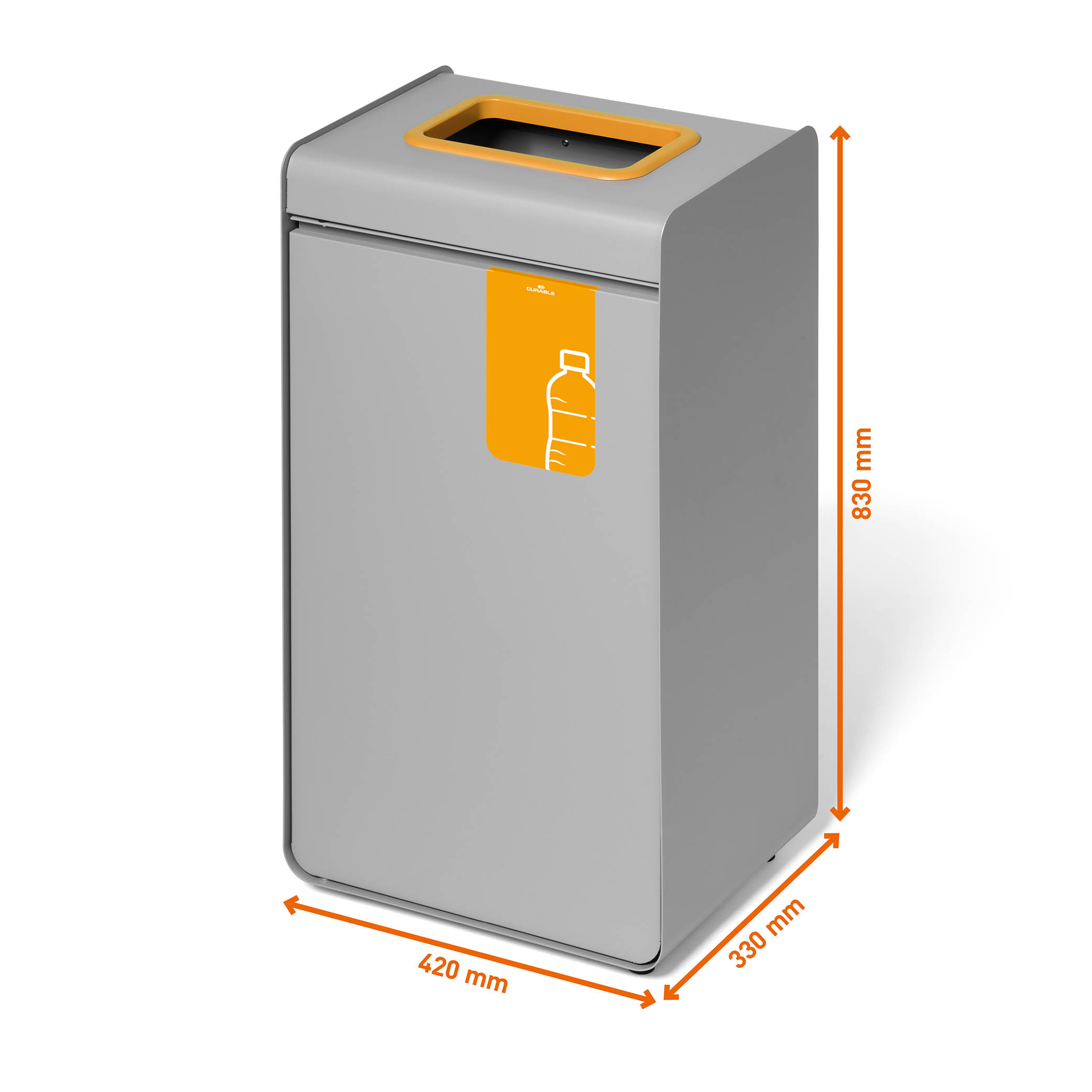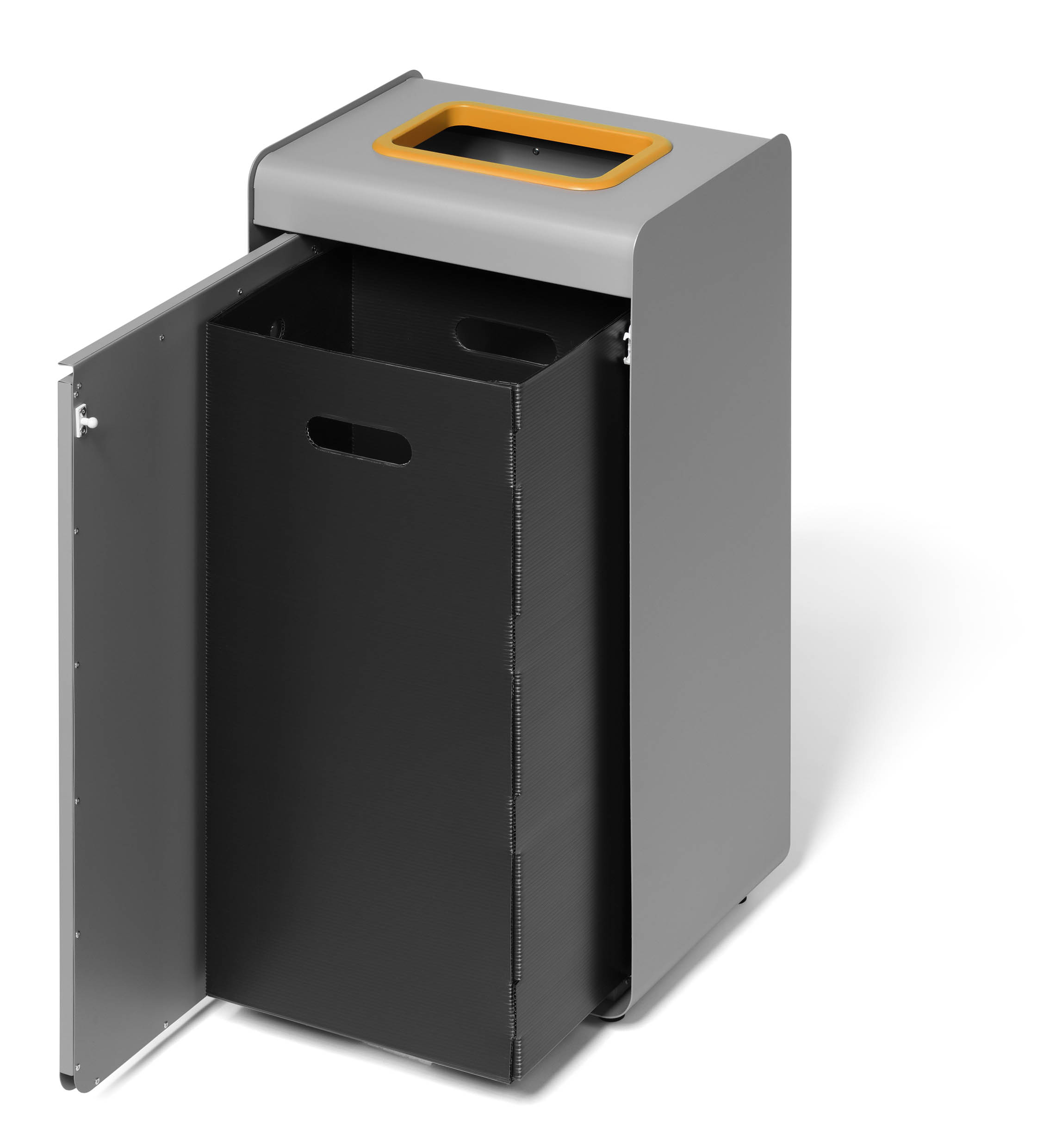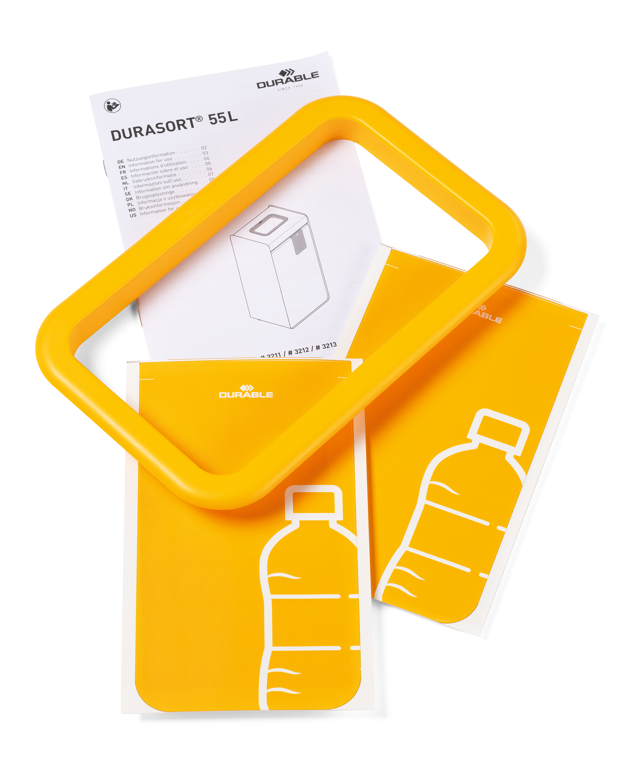 Återvinningskärl Durable Durasort Plastförpackningar Gul 55L är ett återvinningskärl av pulverlackad metall med innerbehållare i plast. Färgad öppning och symbol framtill visar tydligt avfallstypen. Kärlet är avsett för användning inomhus i publika lokaler, skolor, matsalar med mera. Tryck-och-öppna-mekanismen gör det lätt att öppna dörren, och innerbehållaren är enkel att tömma. De justerbara fötterna säkerställer stabilitet på ojämna ytor.