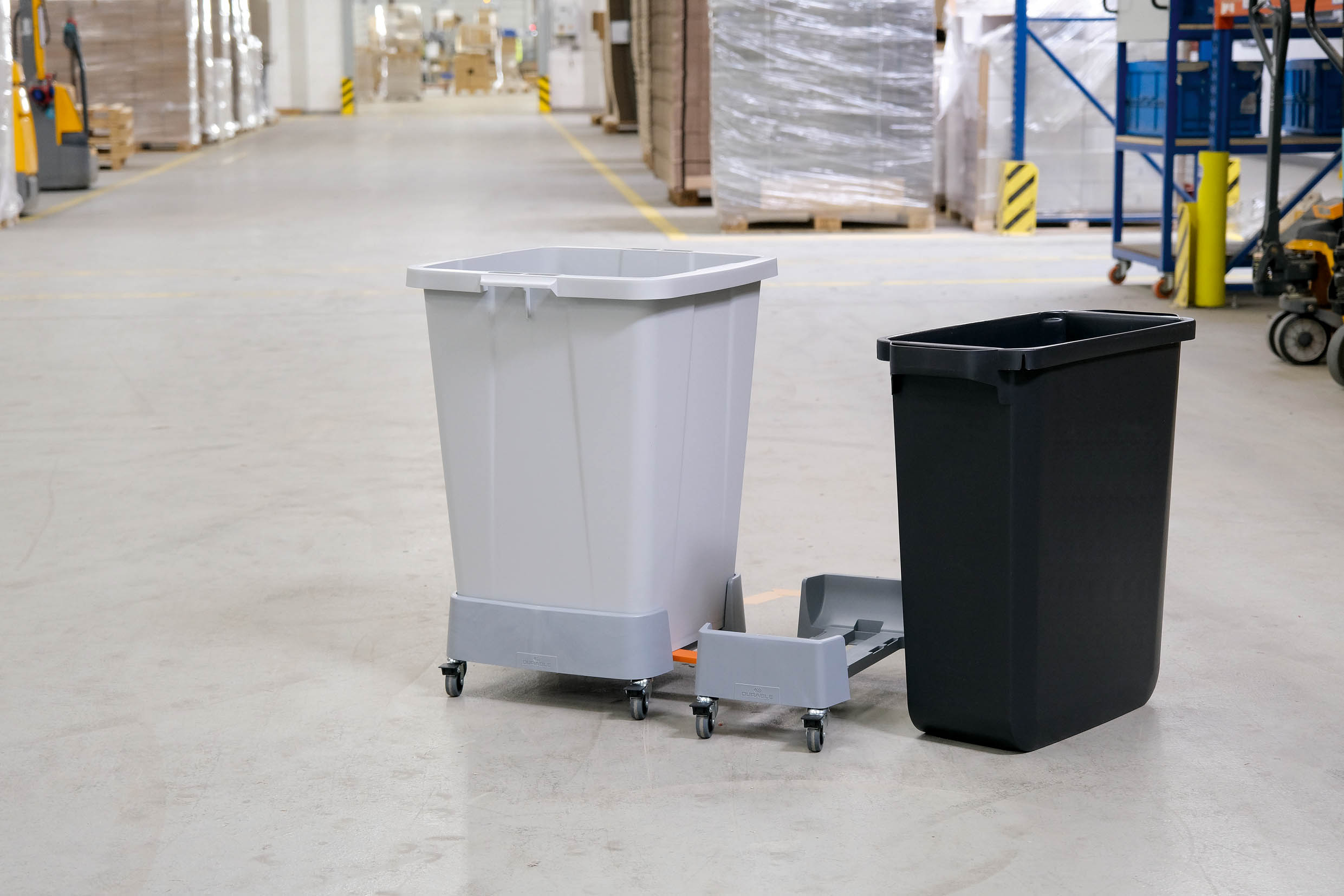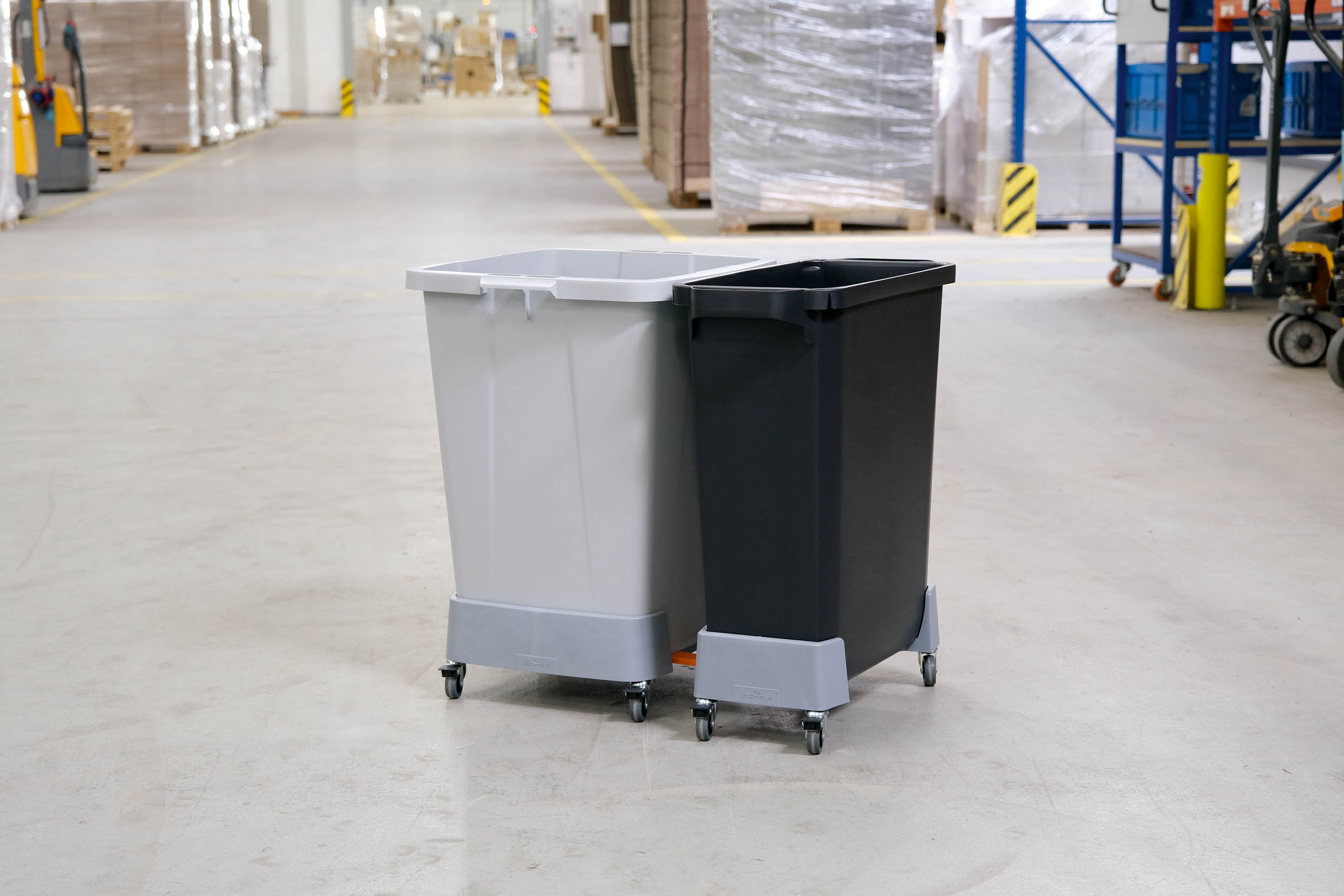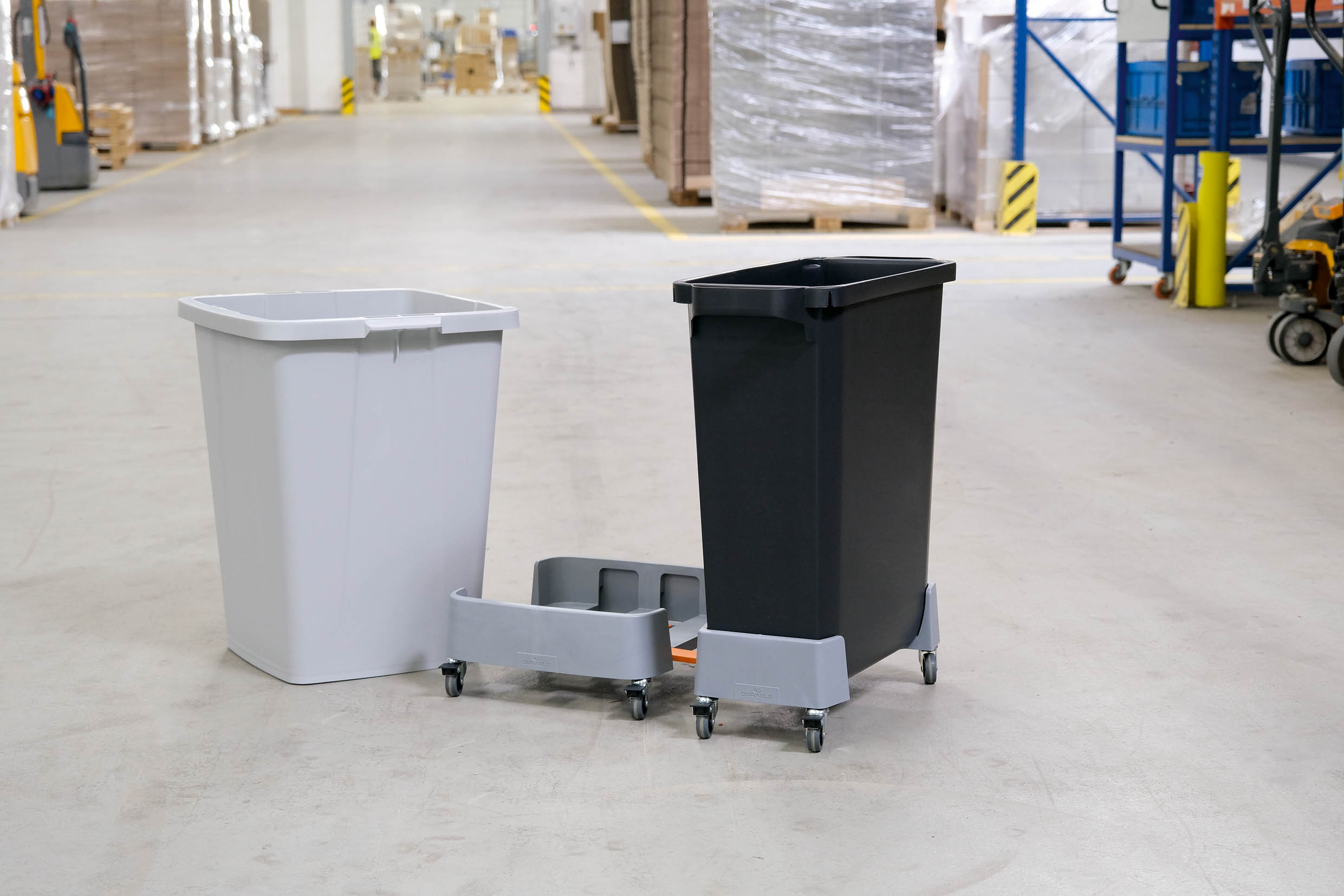 Transportplattan , vagnen , rullbrädan , trallan Durabin 90 rPP gör det lätt att flytta en fylld Durabin 60 liters soptunna på ett smidigt sätt. Det kan t ex vara råmaterial, material som ska återvinnas eller matavfall som ska samlas ihop på annan plats. För inomhus- och skyddad utomhusanvändning på plana ytor i lagerlokaler, produktionsområden, matsalar etc. Upp till 4 rullplattor - för både 60 och 90 liters tunnor, kan kopplas ihop med hjälp av de medföljande och integrerade kopplingarna.