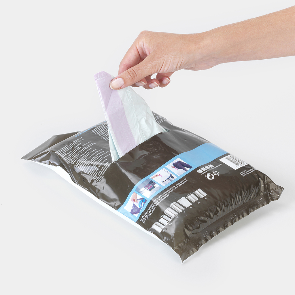 Brabantia skräddarsydda förpackningar, finns i ett stort dispenserpaket som fungerar som en vävnadslåda. Det är en platt väska med stor öppning. Ta bara ett nytt fodrar och dra ut det lätt. De är inte knutna till varandra, precis som de flesta uppsamlade påsar