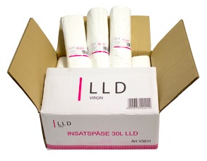 Papperskorgspåse 30L Vit LLD. Lämplig som insatspåse till papperskorgar i olika storlekar. Material LDPE 100% återvunnet.