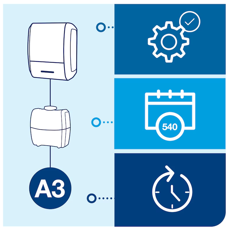 Tork Airfreshener Konstant Dispenser med Elevation-design använder en unik, högteknologisk distributionsteknik som jämnt och oavbrutet sprider doften i utrymmet. Den är certifierad som ”Easy to use” för enkel påfyllning och erbjuder en konstant trevlig toalettupplevelse, vilket bidrar till att minska klagomålen på toalettutrymmena.