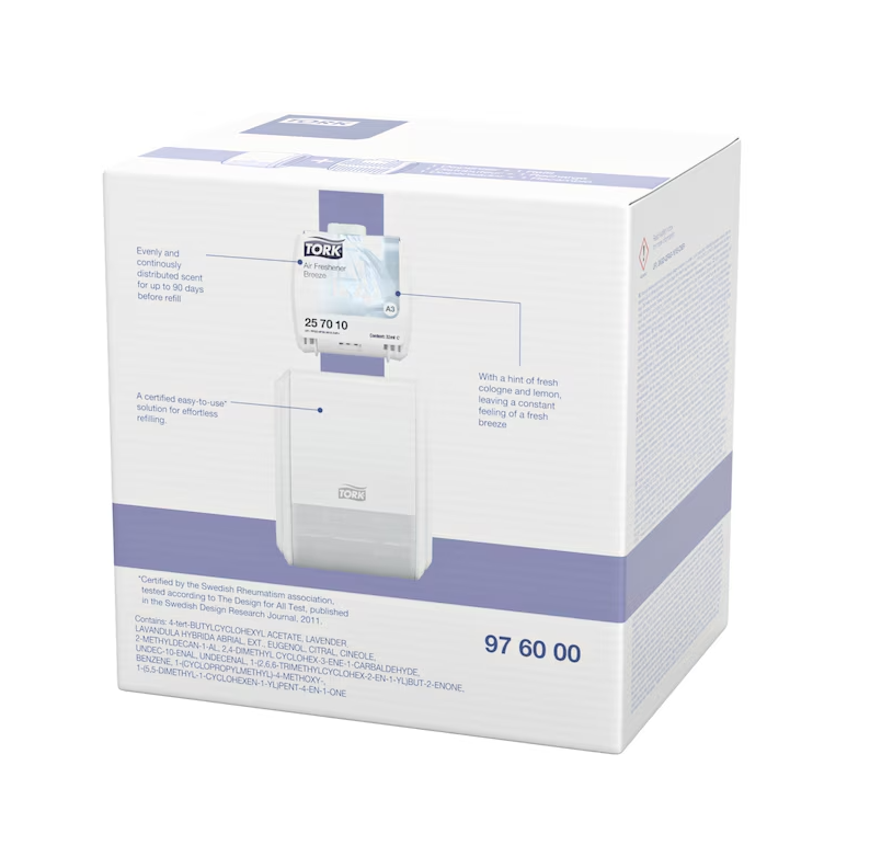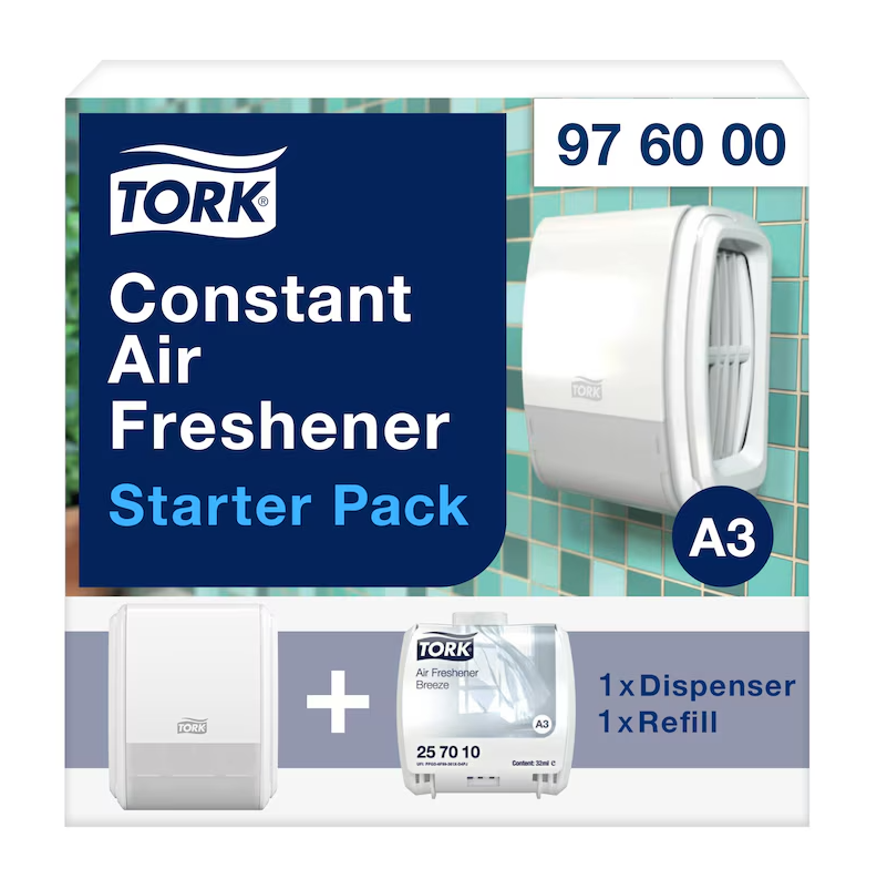 Kontrollera dålig lukt effektivt i toalettutrymmet med Tork Airfreshener Konstant Starter Pack. Innehåller en dispenser och en Bris-refiller. Tork Airfreshener Konstant Dispenser med Elevation-design använder en unik, högteknologisk distributionsteknik som jämnt och oavbrutet sprider doften i utrymmet. ”Easy to use”-certifierad för enkel påfyllning.