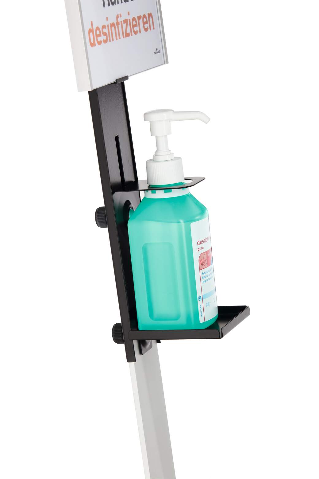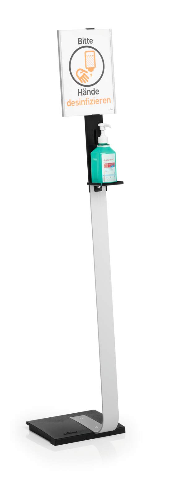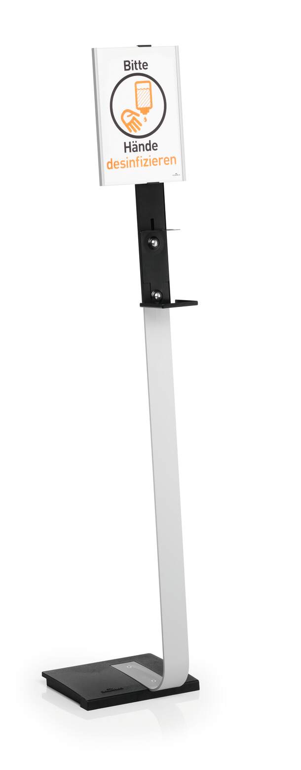 DURABLE Golvstativ för desinfektionsmedel är en robust dispenser av hög kvalitet som kan placeras fritt tack vare sitt mobila golvställ. Informationspanelen är av aluminium och enkel att anpassa med utbytbara kartonginlägg för flexibel märkning.