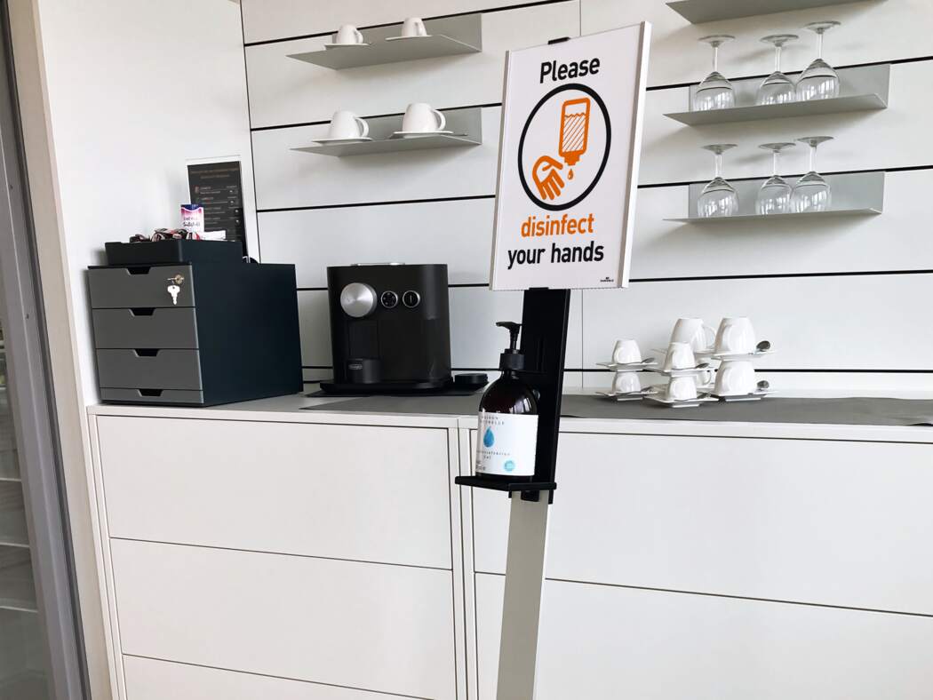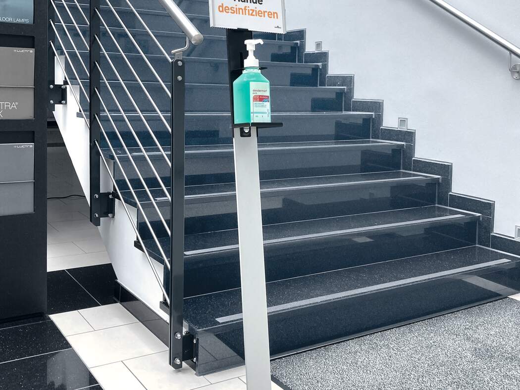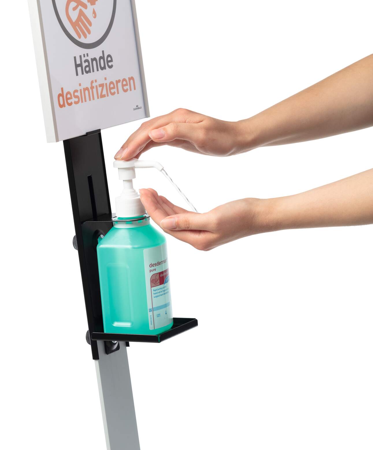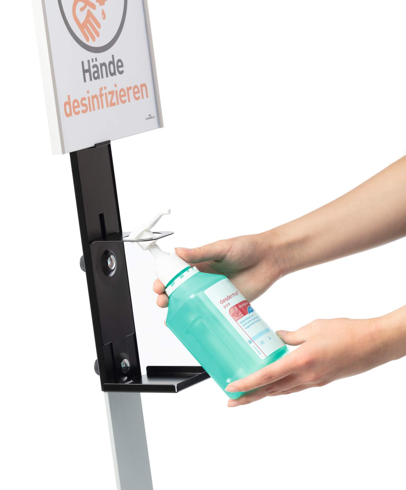 DURABLE Golvstativ för desinfektionsmedel är en robust dispenser av hög kvalitet som kan placeras fritt tack vare sitt mobila golvställ. Informationspanelen är av aluminium och enkel att anpassa med utbytbara kartonginlägg för flexibel märkning.