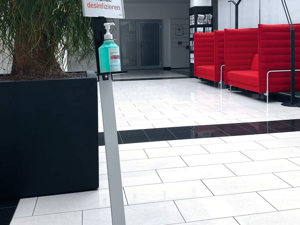 ● Variabel universalhållare – för desinfektionsmedel med doseringspump upp till 88 x 88 x 215 mm (250–ca 750 ml)
