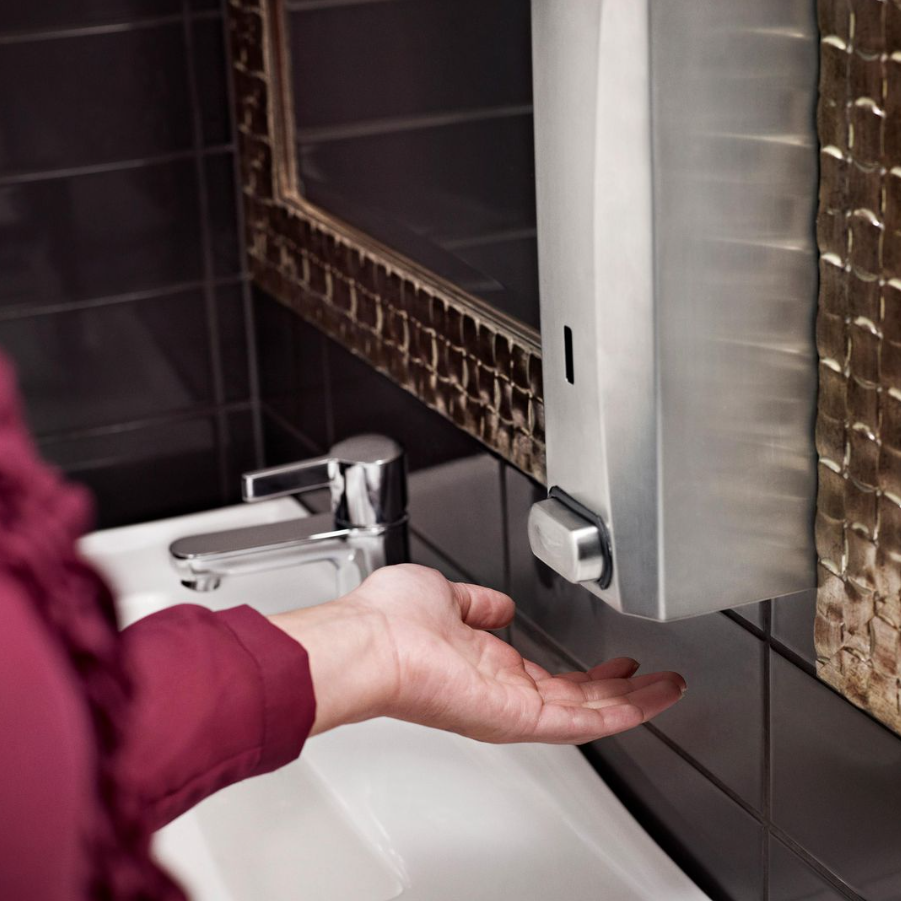 Bidra till en mer hållbar värld genom att installera och använda ett dispensersystem för löddrande tvål. Använd 16 % mindre vatten än om du skulle använda vanlig flytande tvål och spara pengar eftersom löddrande tvål sprids ut betydligt enklare och mindre mängd krävs för att rengöra effektivt. Högkapacitetsdispensern rymmer en 1 literspatron, vilket innebär att byte och underhåll minskas eftersom denna patronstorlek motsvarar 2 500 doser.