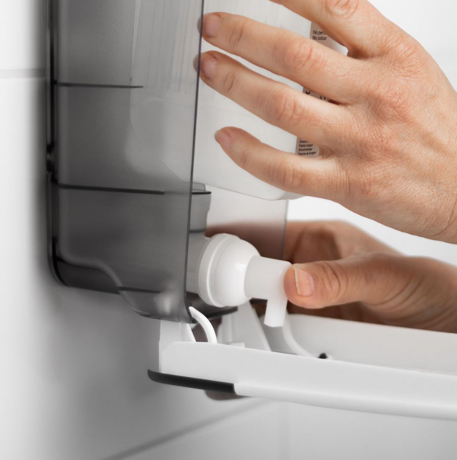Dispenser för ett stort urval av tvålar och handdesinfektion.