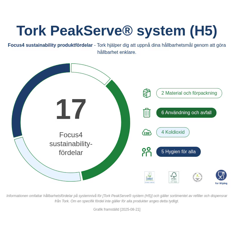 ● Tork PeakServe® har under sin totala livscykel (cradle-to-grave) ett genomsnittligt koldioxidavtryck på 6.0 g CO2-ekv. per användning, där de tre första stegen i livscykeln (cradle-to-gate) står för 4.0 g CO2-ekv. per användning. (Gäller endast för EU).***