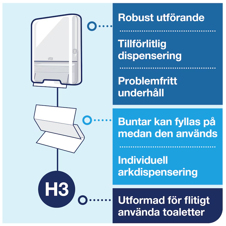 Tork Dispenser Singlefold Handduk Mini H3 i Elevation-design är lämplig för miljöer med låg till medelhög besöksfrekvens. Den tillförlitliga utmatningen av ett ark i taget minskar förbrukningen och därmed avfallet. Elevation-dispensrarna har en funktionell och modern design som lämnar ett bestående intryck på gästerna.