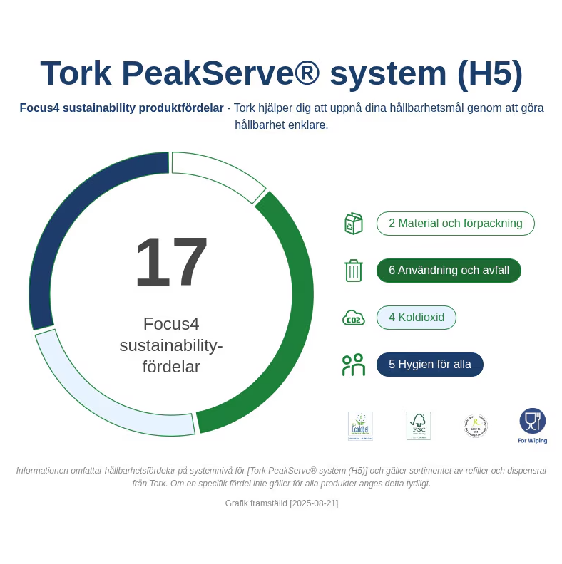 ● Tork PeakServe® har ett genomsnittligt koldioxidavtryck på 6,0 g CO2-ekv. per användning under hela livscykeln (cradle-to-grave), varav 4,0 g CO2-ekv. per användning utgör cradle-to-gate (gäller EU).***