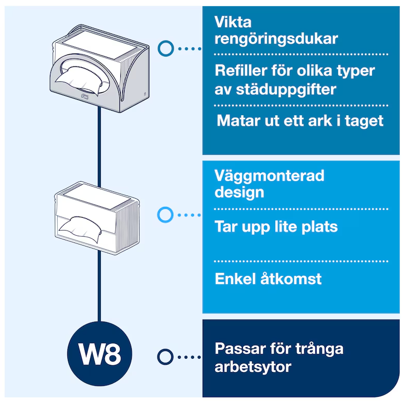Tork Dispenser W8 Vit för Small Pack erbjuder en praktisk och hygienisk lösning för vikta torkdukar. Den väggmonterade designen sparar plats och ger enkel åtkomst till dukarna, samtidigt som den matar ut en duk i taget för att minska förbrukning och avfall.