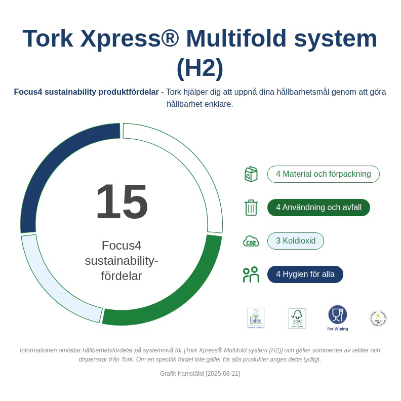 ● Tork Xpress® Multifold har ett genomsnittligt koldioxidavtryck på 10,8 g CO₂-ekv. per användning, varav 7,0 g CO₂-ekv. per användning utgör cradle-to-gate (EU).***