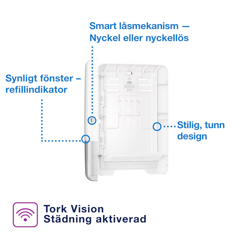 ● Aktiverad för Tork Vision Städning – möjliggör effektivare städning via realtidsinformation.