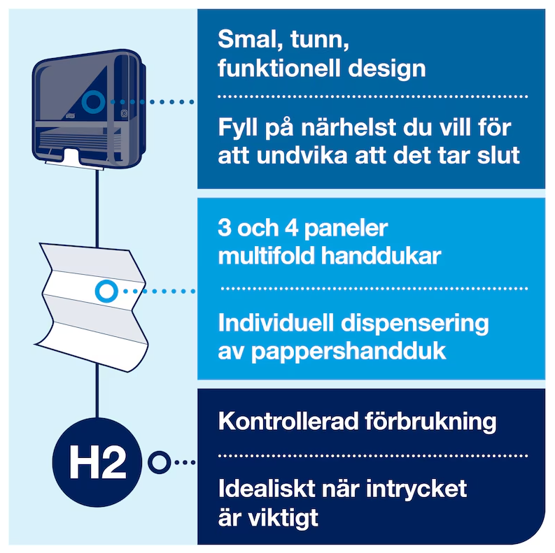 ● Systemet matar ut en handduk i taget – minskar onödig förbrukning och avfall.*