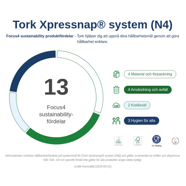 Tork Xpressnap® har under sin totala livscykel (cradle-to-grave) ett genomsnittligt koldioxidavtryck på 3,5 g CO2-ekv. per användning, där de tre första stegen i livscykeln (cradle-to-gate) står för 2,2 g CO2-ekv. per användning. (Gäller endast för EU)*