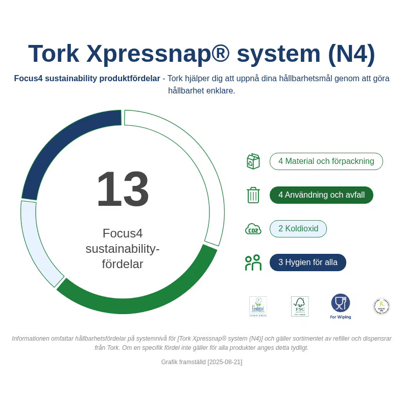 Tork Xpressnap® har under sin totala livscykel (cradle-to-grave) ett genomsnittligt koldioxidavtryck på 3,5 g CO2-ekv. per användning, där de tre första stegen i livscykeln (cradle-to-gate) står för 2,2 g CO2-ekv. per användning. (Gäller endast för EU)*