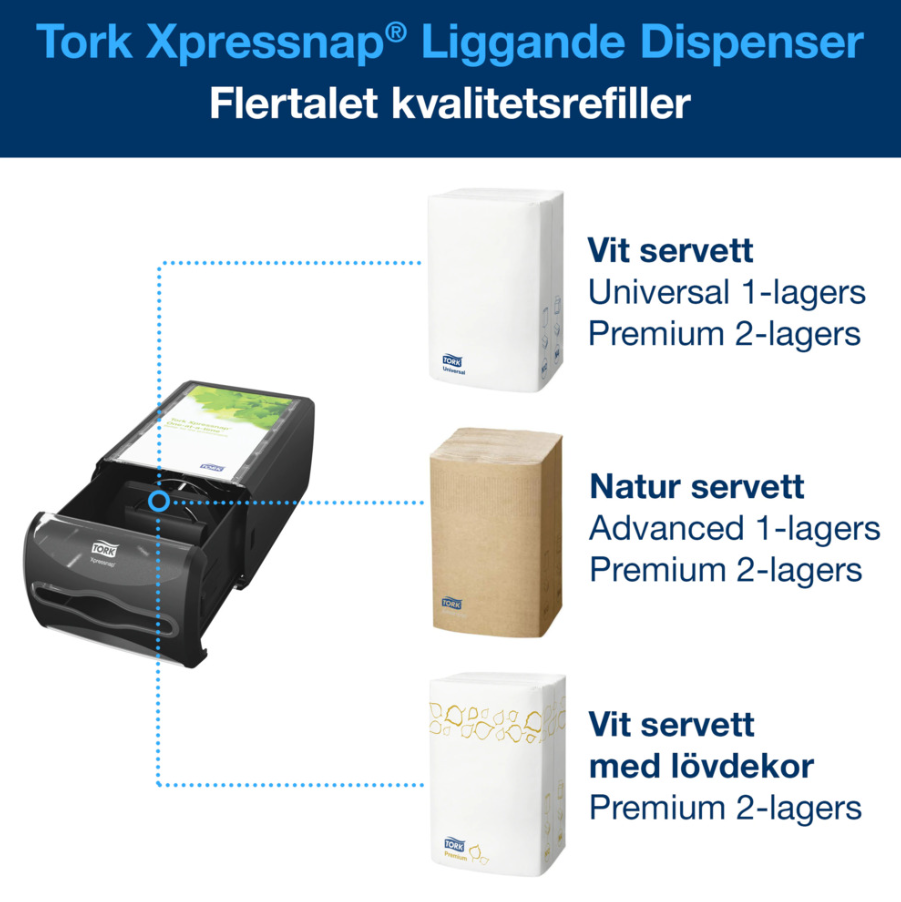 Tork Xpressnap® Liggande Dispenser passar perfekt för restauranger med begränsad service där man erbjuder servetter på en central plats. Den moderna dispensern matar ut en servett i taget. Resultatet blir förbättrad hygien och minskad förbrukning med upp till 43 % jämfört med traditionella servettdispensersystem.