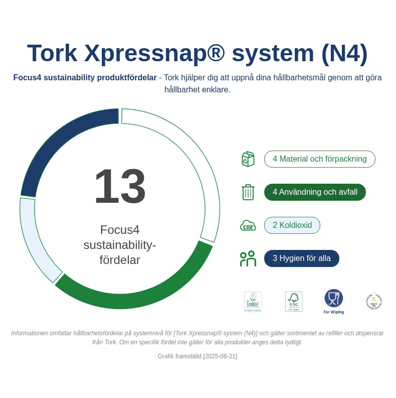 Tork Xpressnap® har under sin totala livscykel (cradle-to-grave) ett genomsnittligt koldioxidavtryck på 3,5 g CO₂-ekv. per användning, där de tre första stegen i livscykeln (cradle-to-gate) står för 2,2 g CO₂-ekv. per användning (gäller endast för EU).
