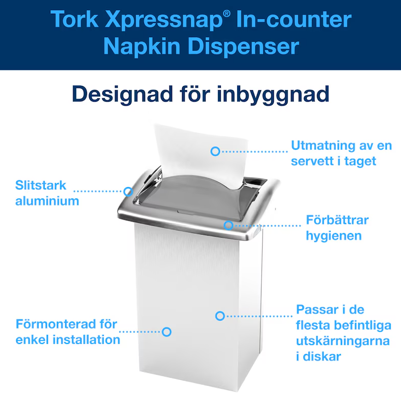 Tork Xpressnap® N4 Inbyggnads Medium är en kompakt och stilren servettdispenser designad för inbyggnad i bordsytor, vilket sparar utrymme och skapar en ren, modern look. Perfekt för restauranger och caféer där både hygien och effektivitet är viktiga.