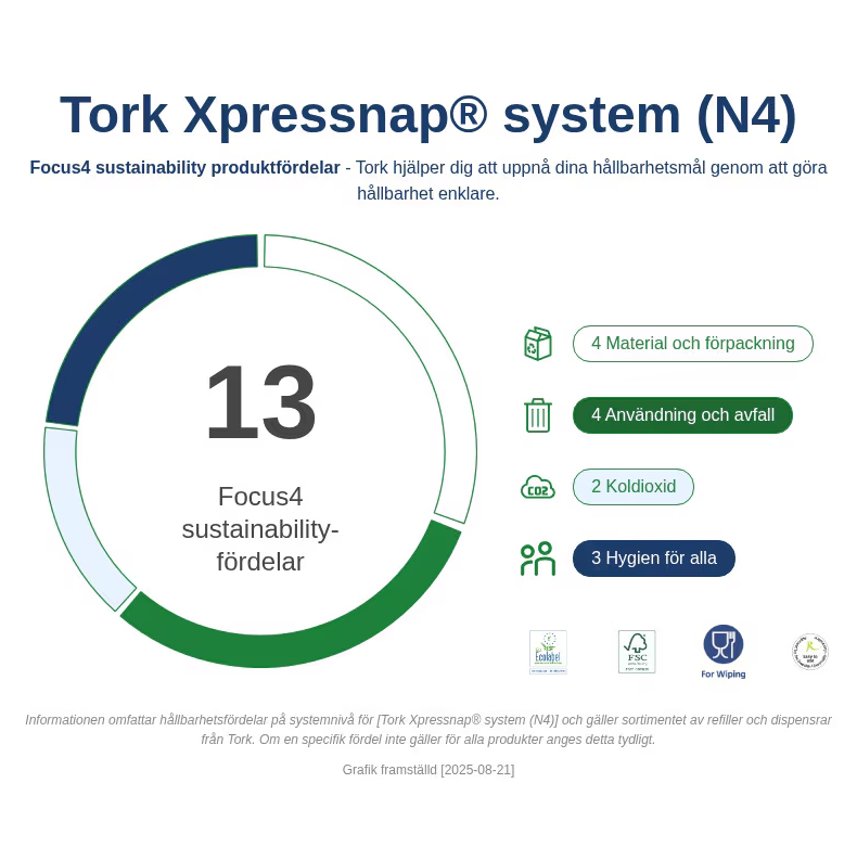 ● Tork Xpressnap® har ett genomsnittligt koldioxidavtryck på 3,5 g CO₂-ekv. per användning under hela livscykeln (cradle-to-grave), varav 2,2 g CO₂-ekv. per användning utgör cradle-to-gate (EU).*