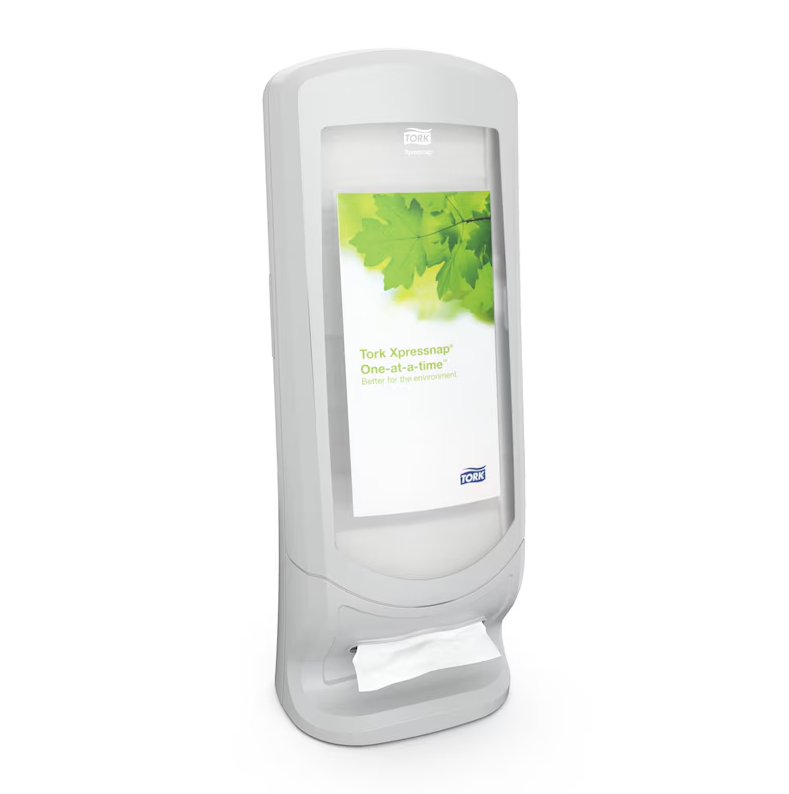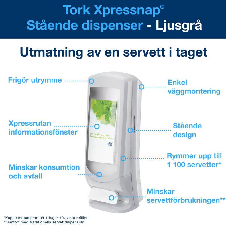 Tork Xpressnap® Stående Dispenser är perfekt för restauranger med hög trafik och begränsad betjäning. Den moderna designen matar ut en servett i taget, vilket förbättrar hygienen och minskar förbrukningen med minst 25 % jämfört med vanliga servettdispensrar.