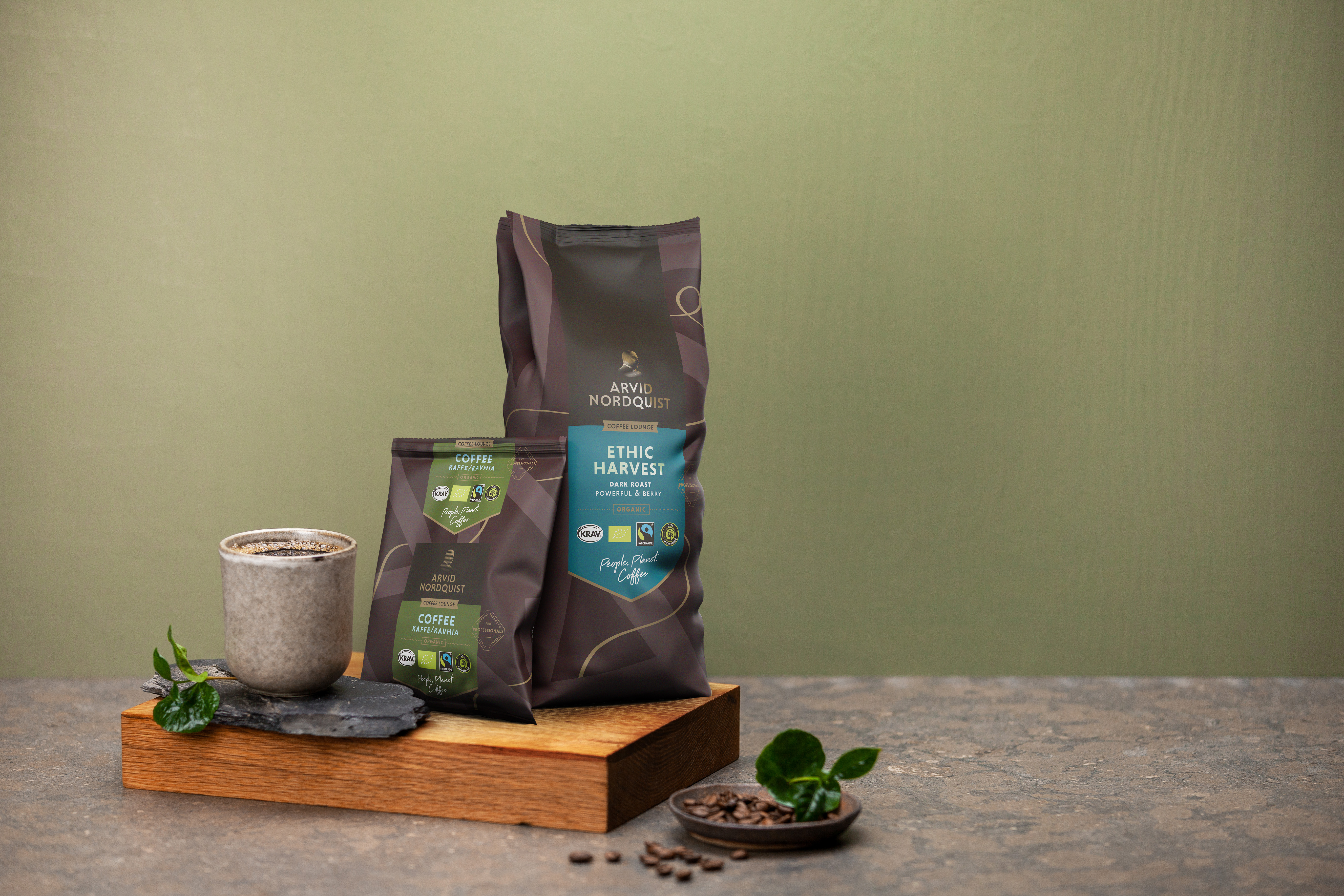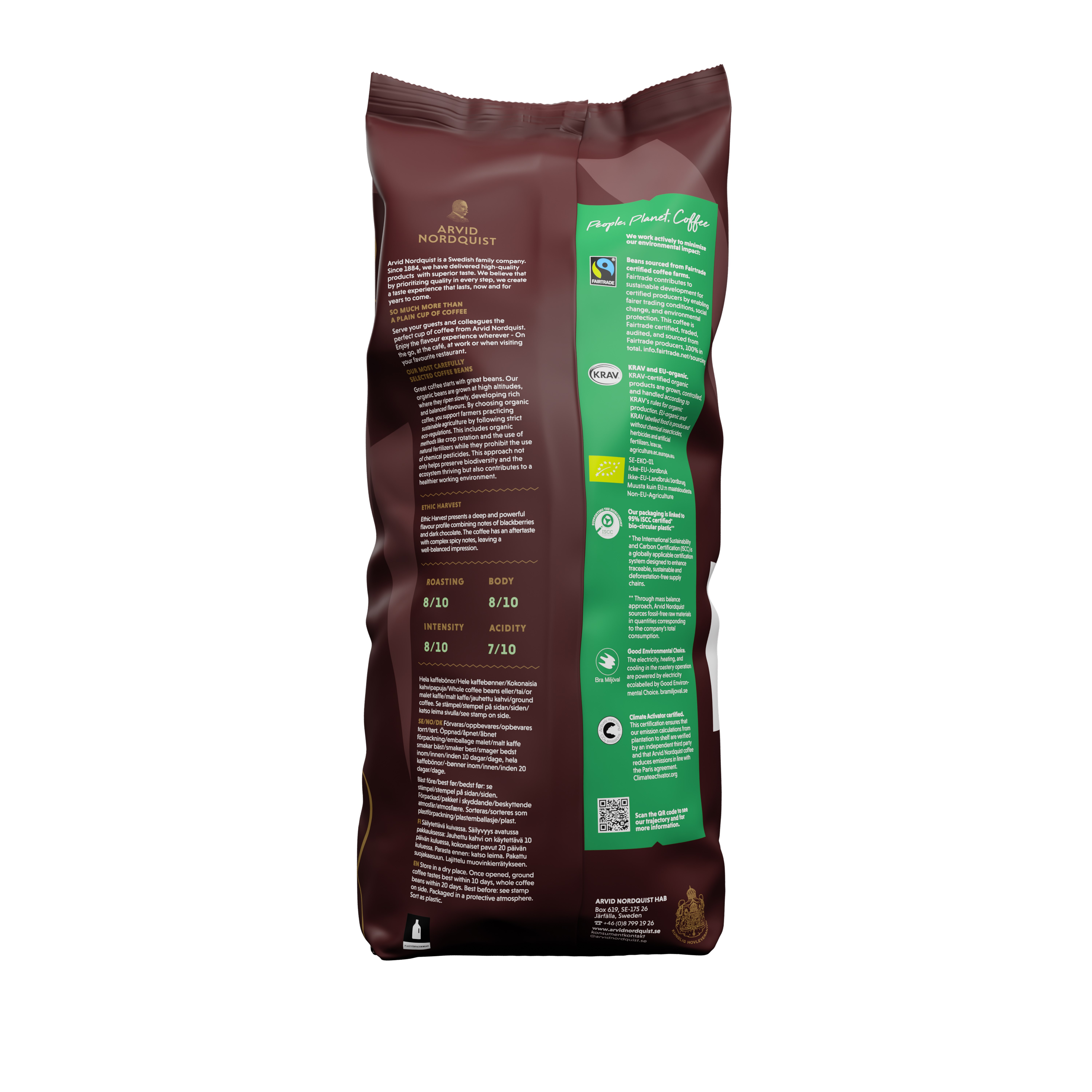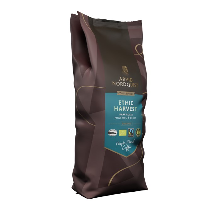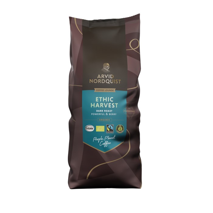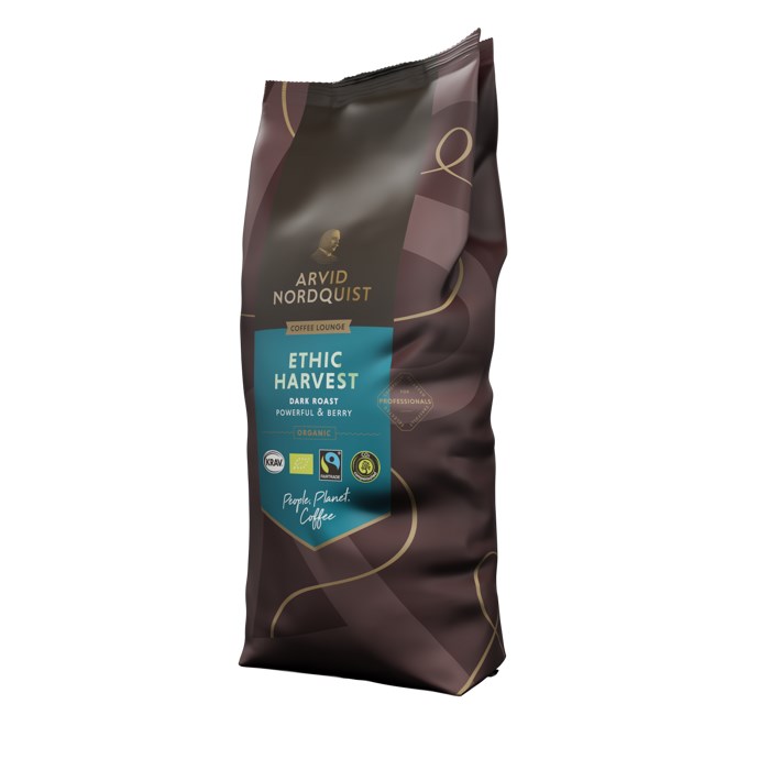 Arvid Nordquist Ethic Harvest är ett mörkrostat kaffe med kraftfull smak och tydliga toner av mörka bär. Den fylliga och balanserade eftersmaken ger en rik kaffeupplevelse med livlig syrlighet och kryddiga undertoner av lakrits. Kaffet har en ren doft av nöt och rostas helt utan användning av fossila bränslen. Ethic Harvest är 100% Fairtrade-certifierat, 100% ekologiskt och 100% klimatkompenserat – ett hållbart val från böna till kopp.