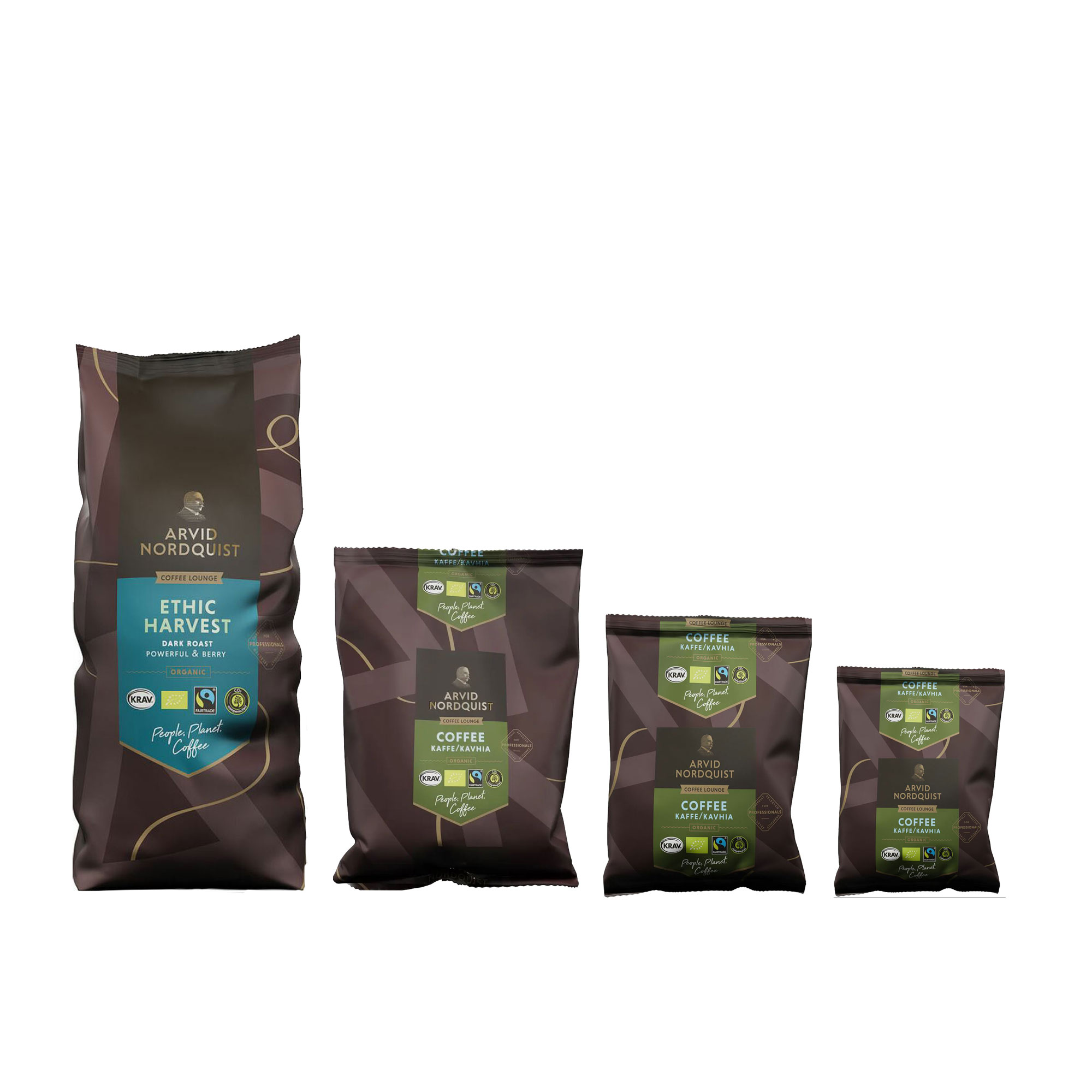 Arvid Nordquist Ethic Harvest är ett mörkrostat kaffe med kraftfull smak och tydliga toner av mörka bär. Den fylliga och balanserade eftersmaken ger en rik kaffeupplevelse med livlig syrlighet och kryddiga undertoner av lakrits. Kaffet har en ren doft av nöt och rostas helt utan användning av fossila bränslen. Ethic Harvest är 100% Fairtrade-certifierat, 100% ekologiskt och 100% klimatkompenserat – ett hållbart val från böna till kopp.